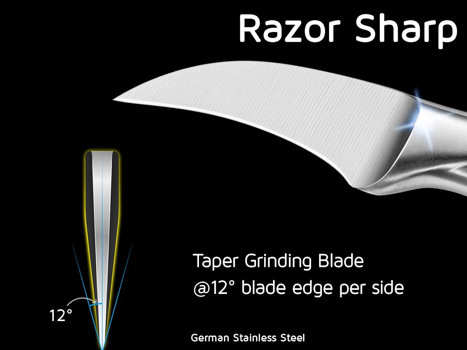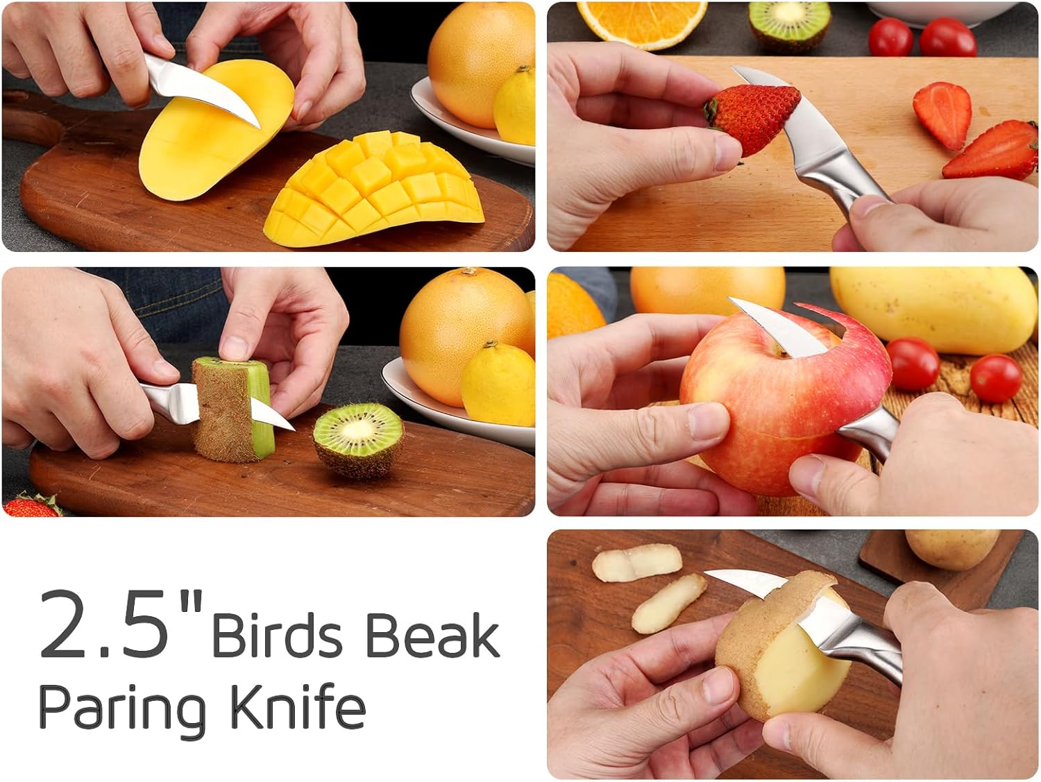 - 【SUPER SHARP GERMAN STEEL BLADE】The bird’s beak paring knife is precisely forged of premium German Stainless Steel DIN1.4116, hardness up to HRC56±2. The 12-degree blade edge per side ensures maximum sharpness, ideal for peeling fruits and vegetables, removing blemishes, and creating beautiful garnishes.