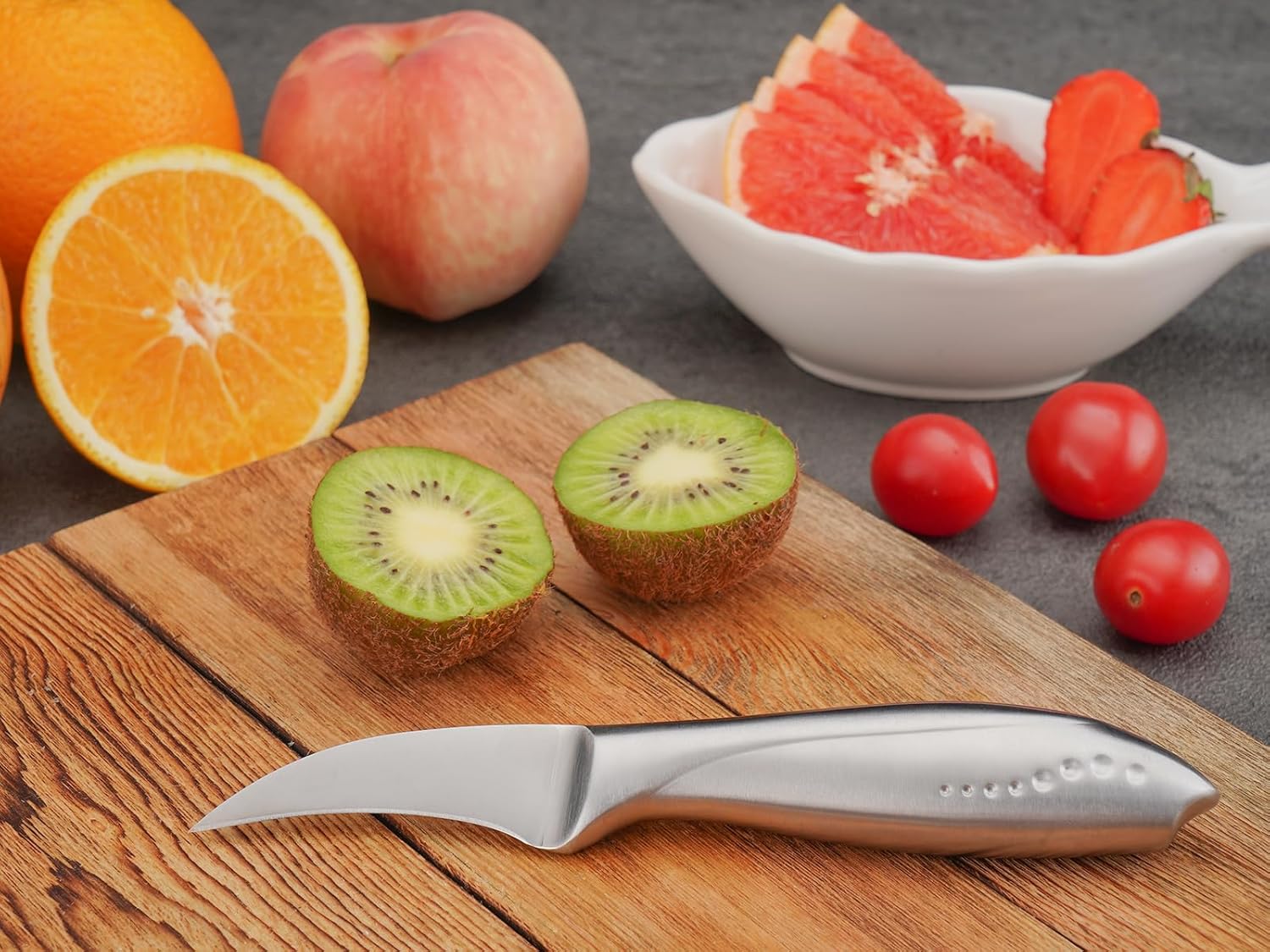 - 【ERGONOMIC PATENTED HANDLE】This 2.5 in fruit peeling knife handle is made by stainless steel for life-long durability. The patented whole stainless steel handle increases the extra strength and durability. Ergonomically designed handle shape and construction ensures a secure and comfortable grip.