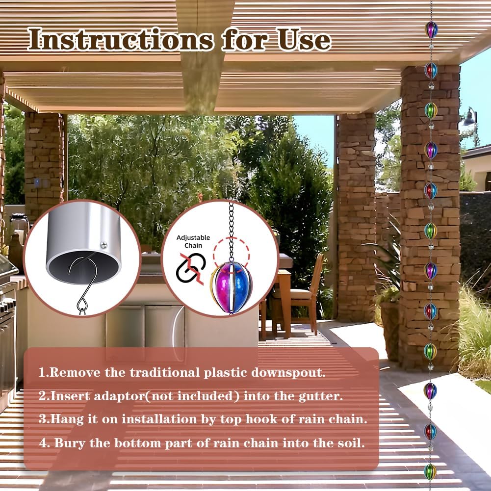 - Elegant Alternatives: The 9.7 ft hot balloon rain chain consists of 12 hot air balloons (2.9'' W, 3.54'' H) and chains. The size of the rain water chain is suitable for standard single-story buildings and adds a chic touch to roofs and awning dens. An elegant alternative to traditional gutter downspouts