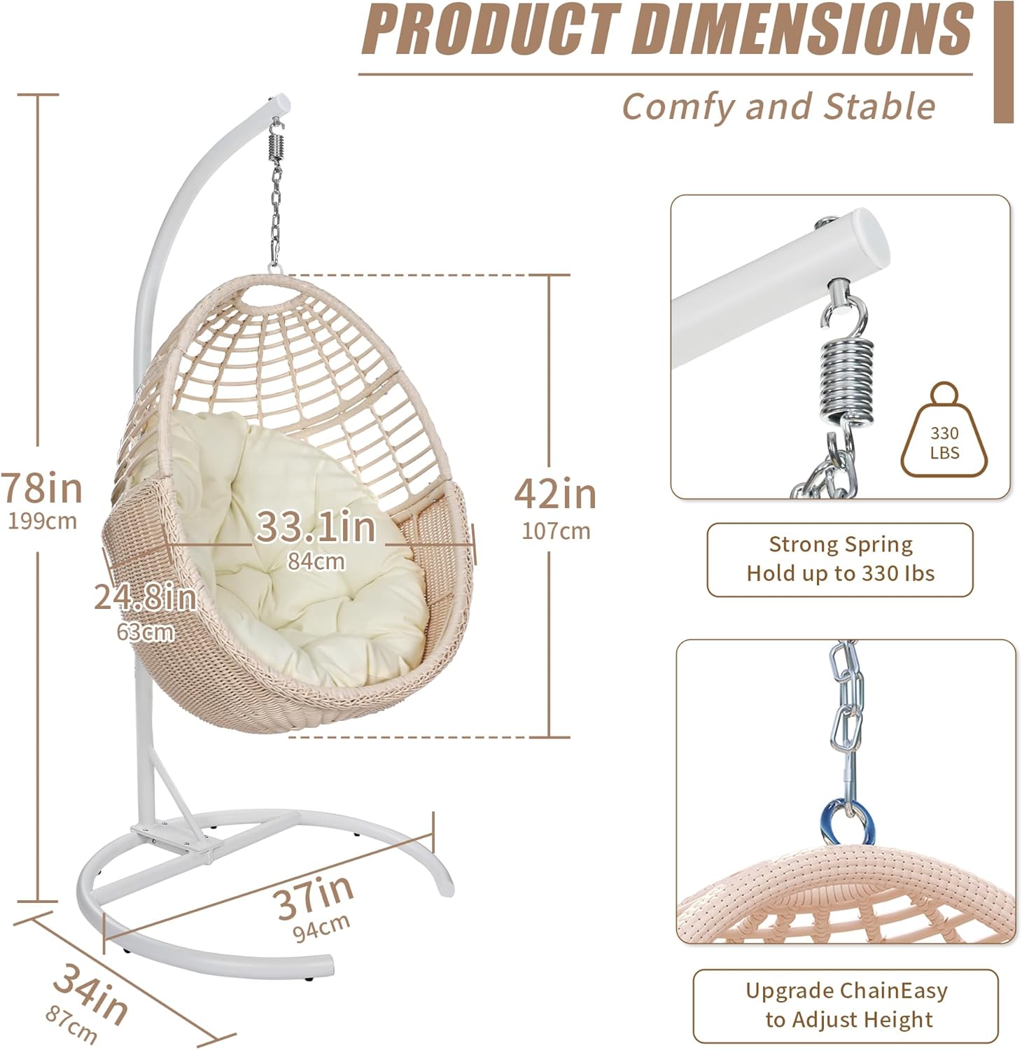 - Beige Wicker Rattan Construction: Our egg chair indoor is hand woven from wicker rattan,durable and stylish material that adds a touch of elegance to any setting.Wrapped around with all-weather PE rattan resin wicker, greatly increases the strength and durability of the swing chair for more than 2 years of use