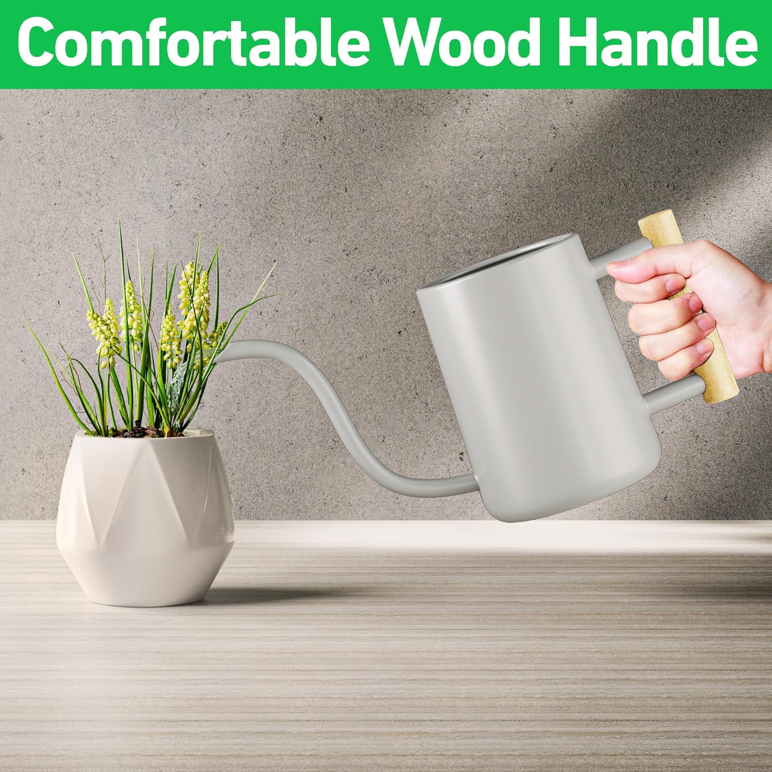 - COMFORTABLE REAL WOOD HANDLE - The smooth ergonomic handle fits perfectly in the palm of your hand, making watering your plants easy, efficient and enjoyable.