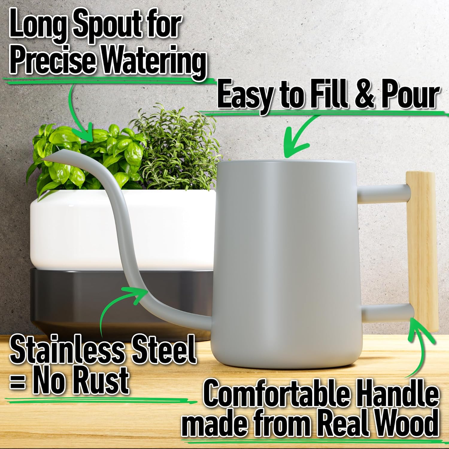 35 oz Metal Small Indoor Watering Can with Long Spout & Real Wood Handle for House Plants, Succulents, Cacti & Seedlings - Gray Long Spout Watering Can Indoor Plants - Stylish, Gentle Flow, No Spills