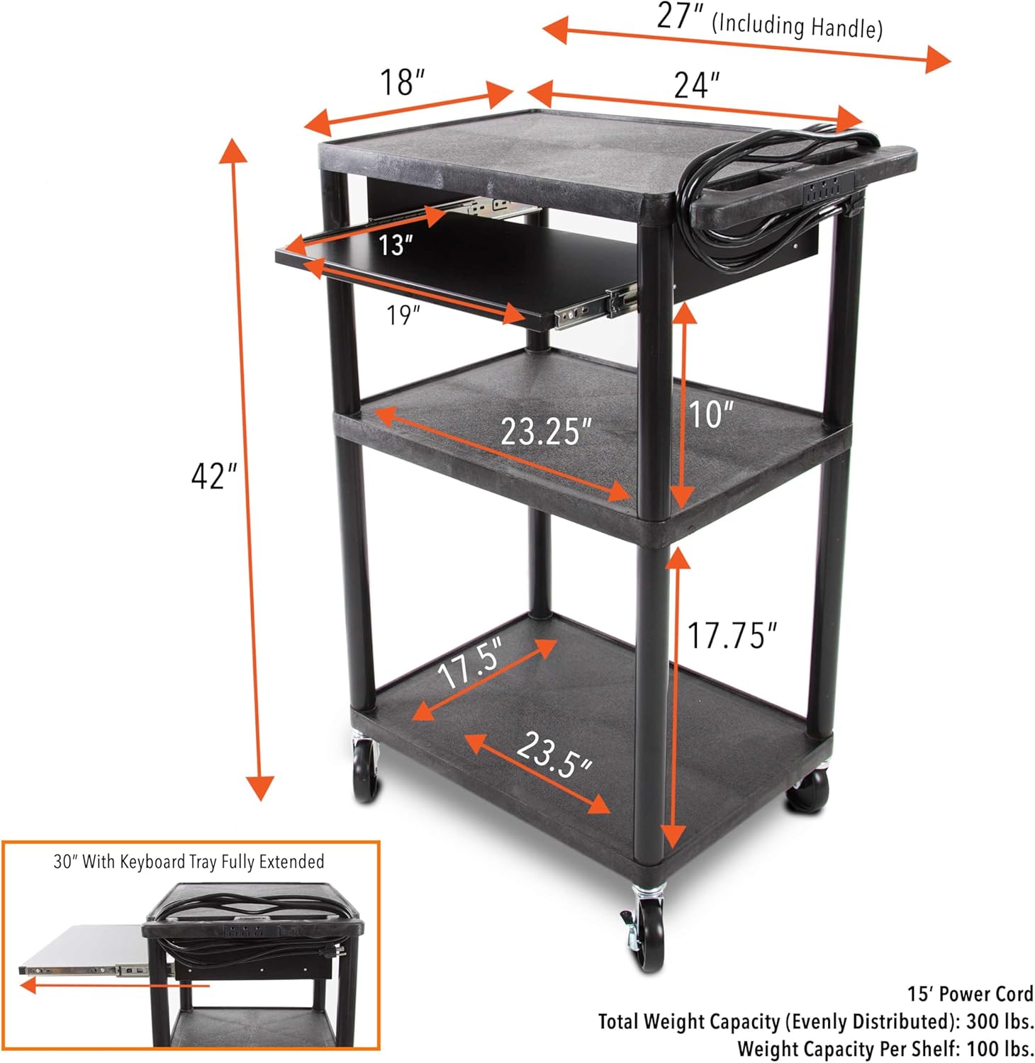 - BUILT-IN POWER STRIP: The Line Leader Rolling Cart has a 3-outlet power strip built right into the handle and a 15’ power cord!