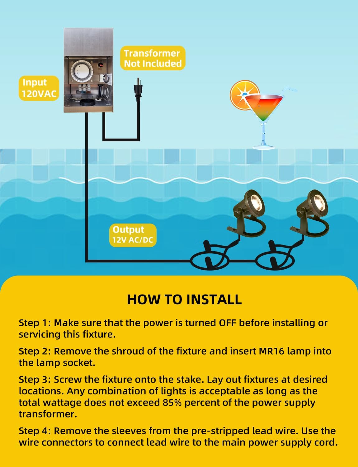 - Energy Efficiency: The heavy-duty patio pond underwater LED lights are energy efficient, with 5W, 2700K, 45 degree LED MR16 bulbs that will help you save up to 80% in electricity costs. They are suitable for an average of 50,000 hours to avoid the trouble of frequently replacing the bulb. Experience true color rendition with our 85+ CRI landscape lights.Please note that this LED pond light doesn't have plug, must be powered by a 12-24V low-voltage transformer (not included).