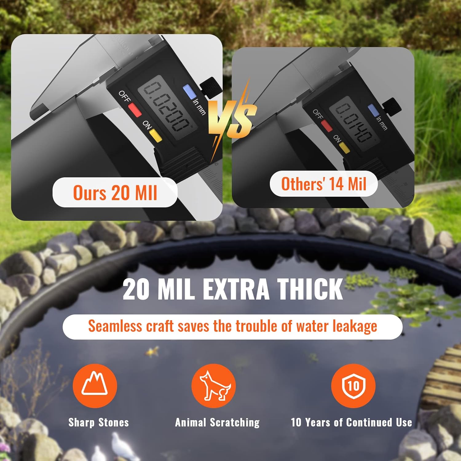 VEVOR 10 x 13 ft Pond Liner, 20 Mil Thickness, Pliable & Durable LLDPE Material, Easy Cutting Underlayment for Fish or Koi,Waterfall, Fountains, Water Gardens, Black
