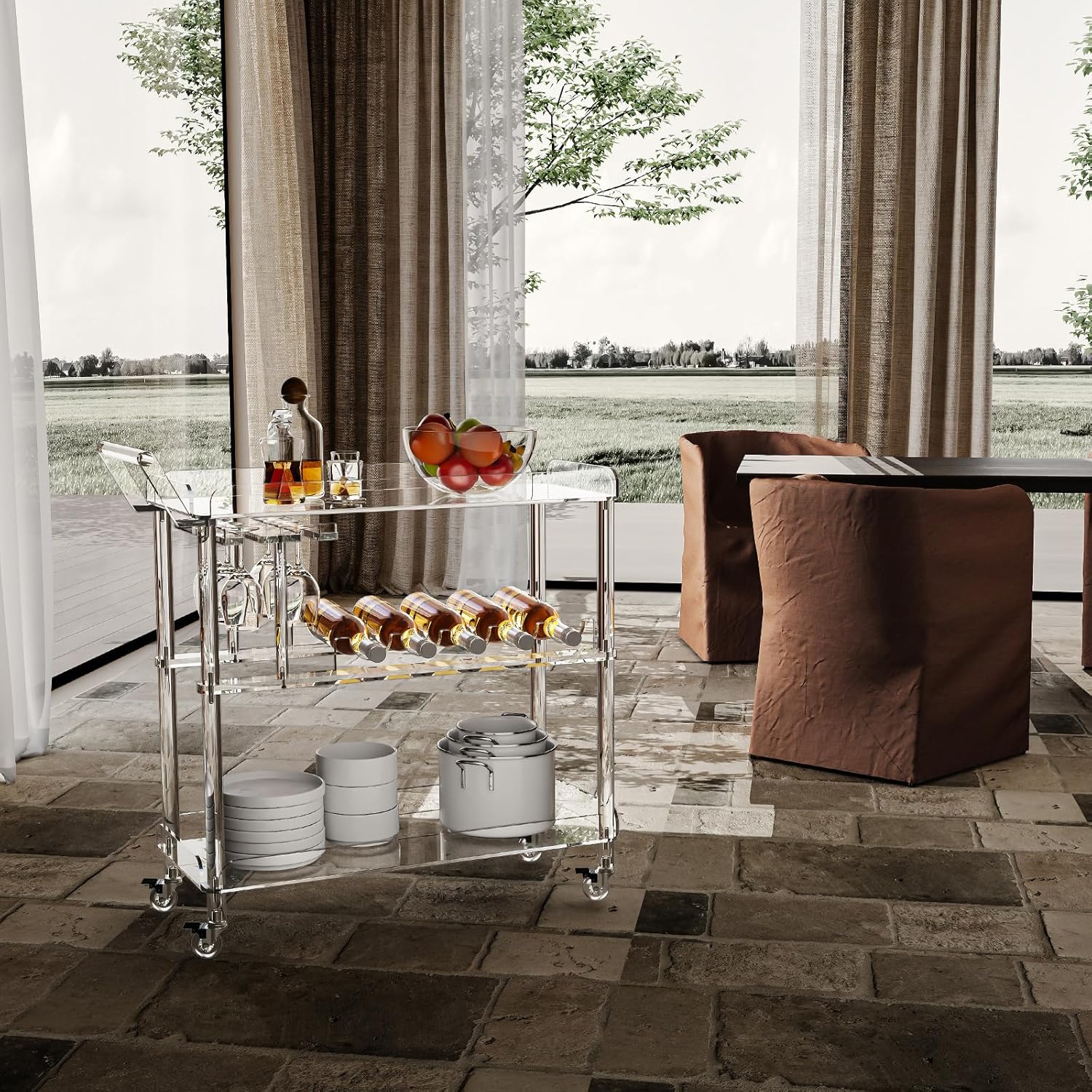 - Functional Acrylic Cart: This bar cart comes with wine rack that can hold up to 6 wine glasses and 5 compartments for wine bottle storage. The fenced edges prevent your items from falling while the cart is moving.