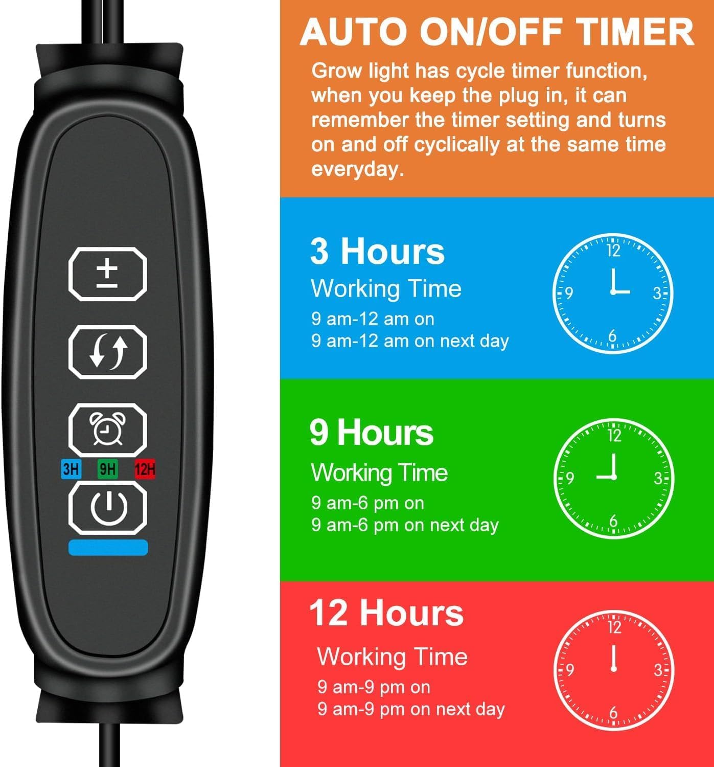 - Timing and Dimming Function:This indoor seedling light offer the circular memory timer function with 3 options-3/9/12H. When keeping power on , it can automatically turn on and off every day according to your settings.【 You Could Operate One of Them Separately and Support 10 Levels of Dimming.】