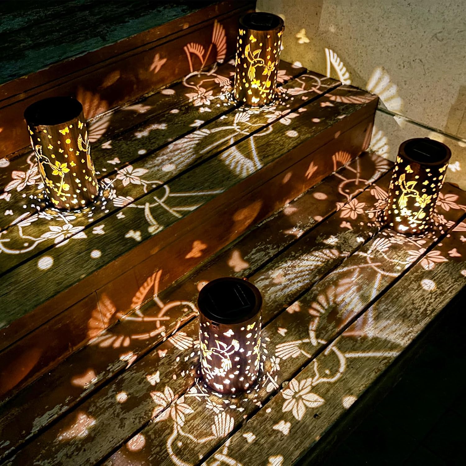 - Gorgeous & imaginative Garden Decor - Fusion the retro gold, copper of exteriors and irregular pattern inside, at darkness, the solar lantern casting a bright, warm light with hummingbird patterns, which looks like they are real and flying