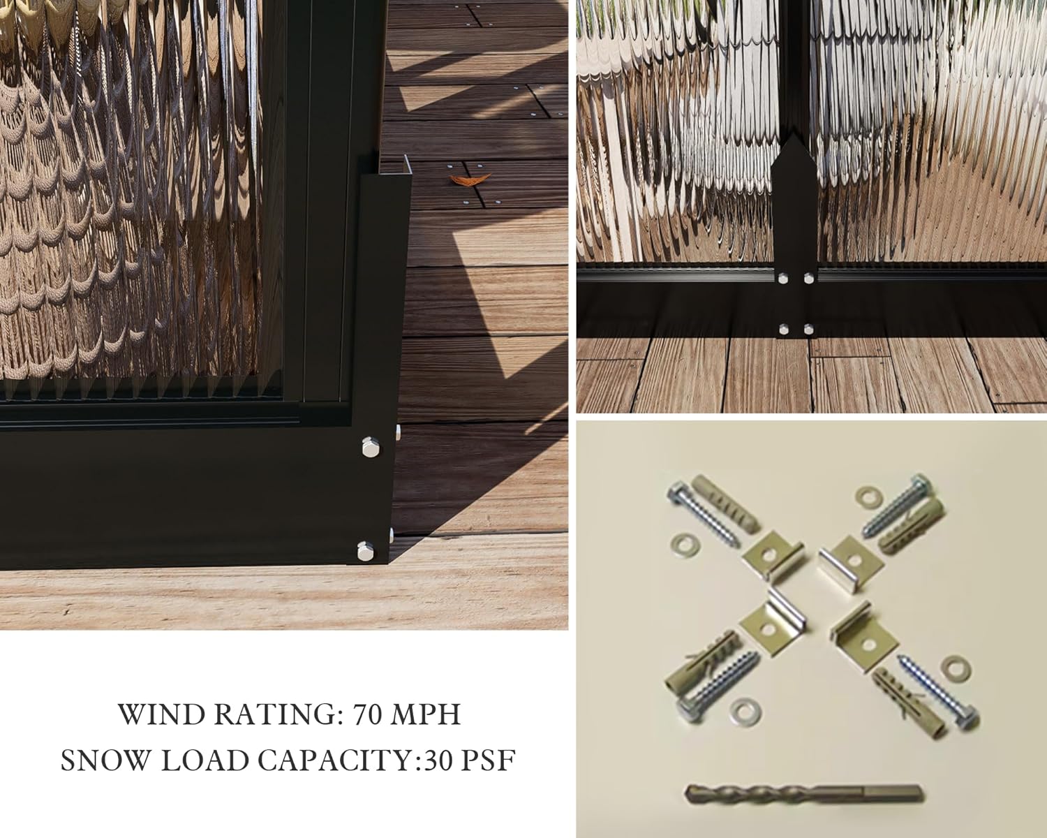 - Reinforced Windproof Firmware: 4 corner posts & 2 middle posts, equipped with strenghtened expansion screws, bury winter greenhouse kits deep in soil or concrete for added stability. Wind Rating: 70 mph; Snow Load Capacity:30 psf