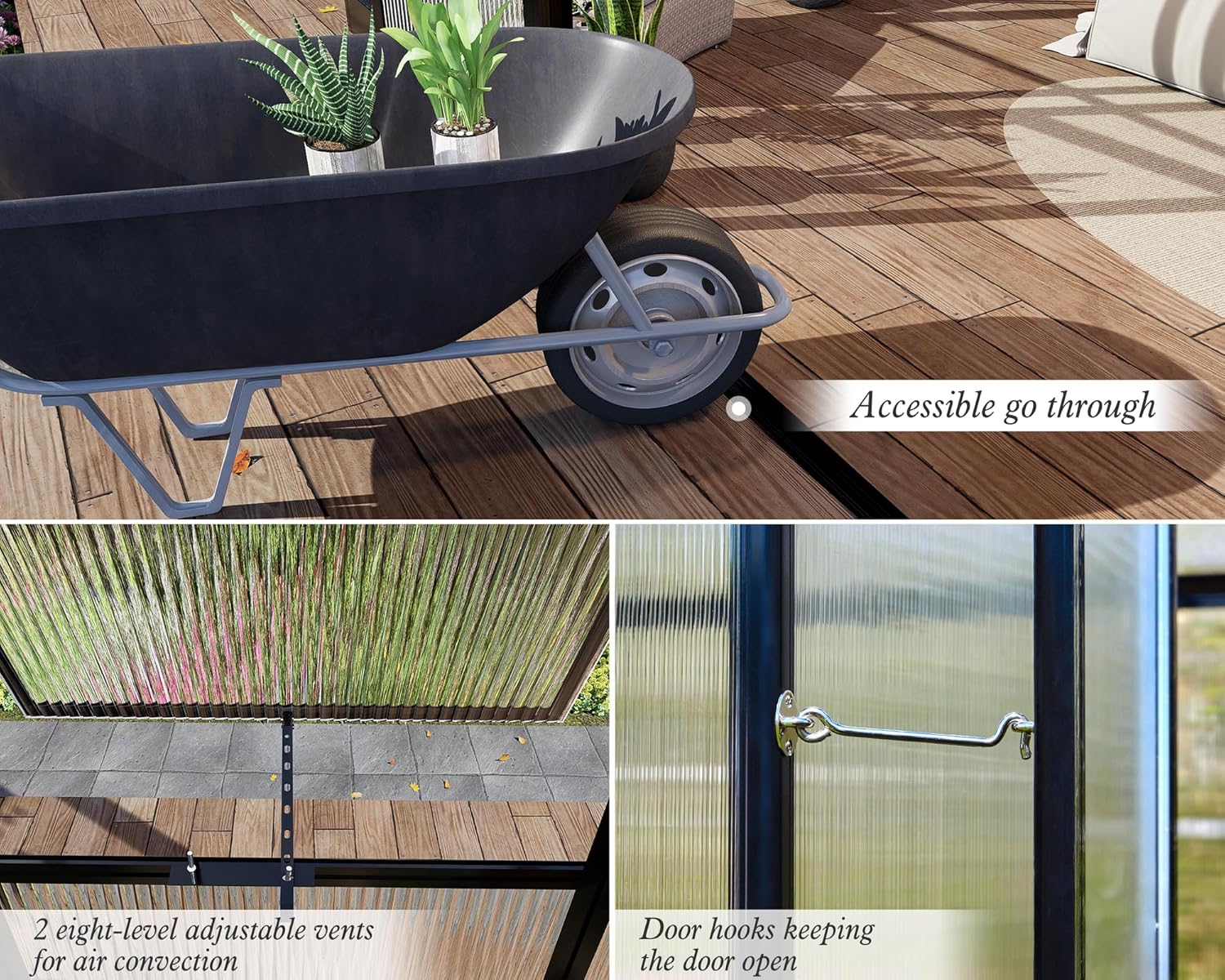 - Walk-in Greenhouse for Better Ventilation: 2 wide swing doors (with door hooks) for easy entry to machineries and people. 2 eight-level adjustable side vents for air convection to manage excess moisture of the backyard greenhouse