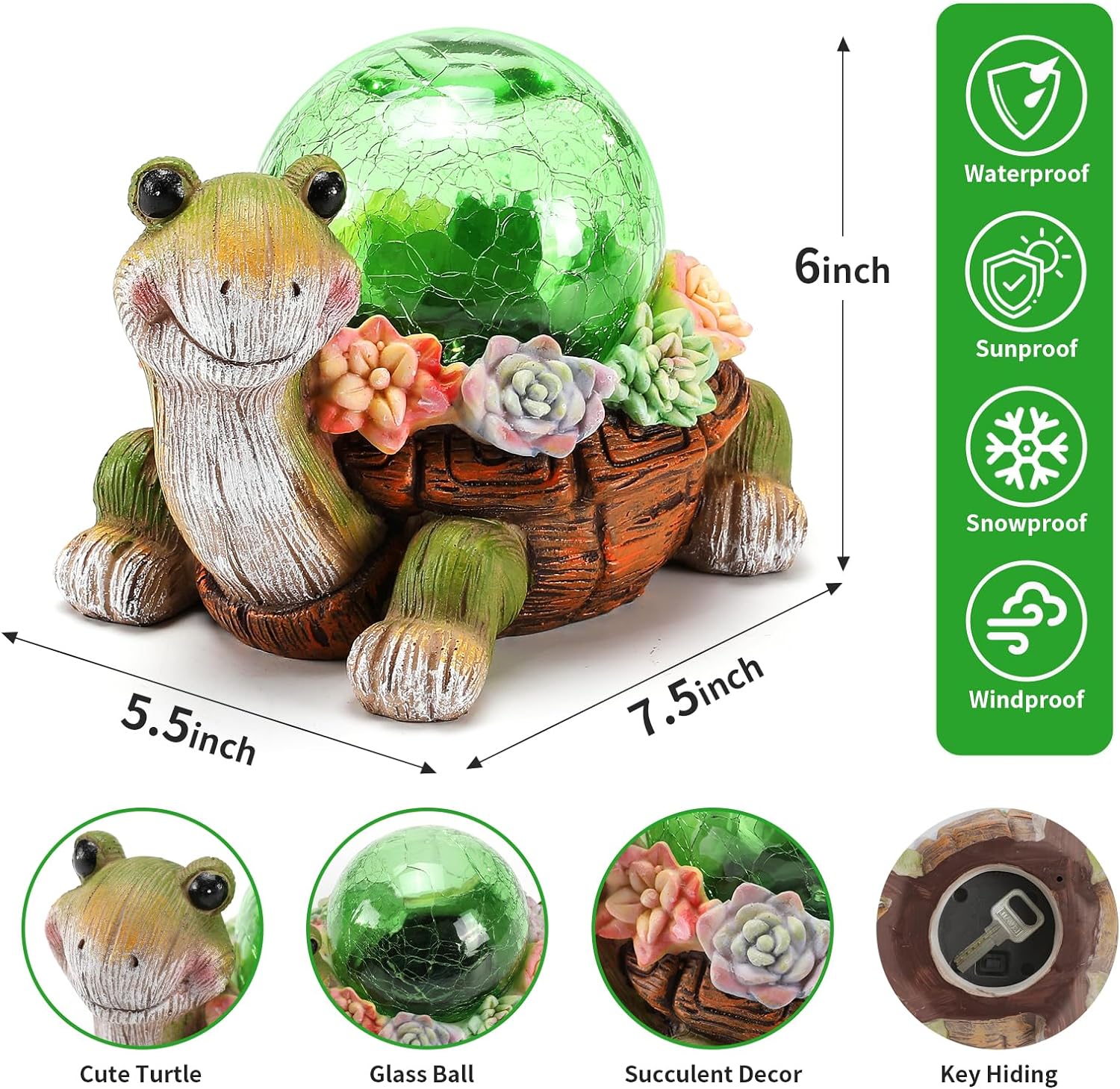- 【RELIABLE MATERIAL】 Outdoor garden turtle statue is made of high quality resin and hand painted to ensure durable and elegance. There is a space about 2.7 inches in diameter at the bottom of tortoise solar light, which is a perfect hiding place for keys. As a cool craft item perfect for Housewarming, Weddings, Birthdays and Christmas gifts
