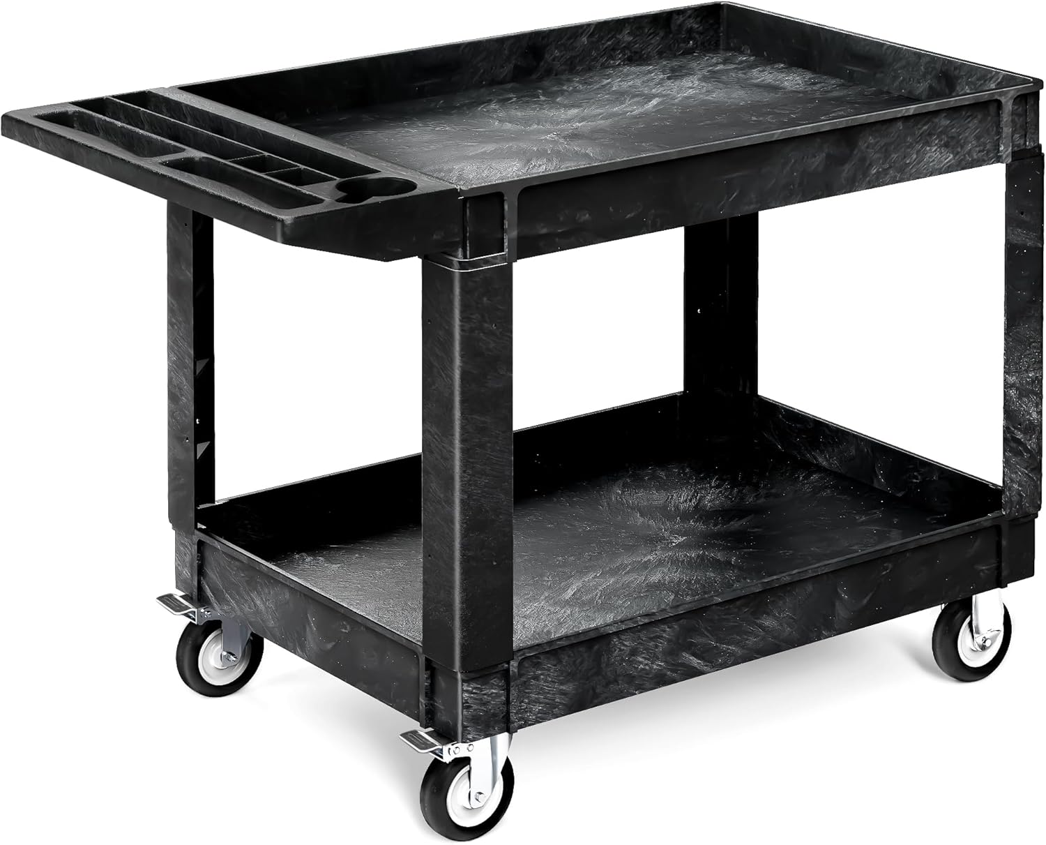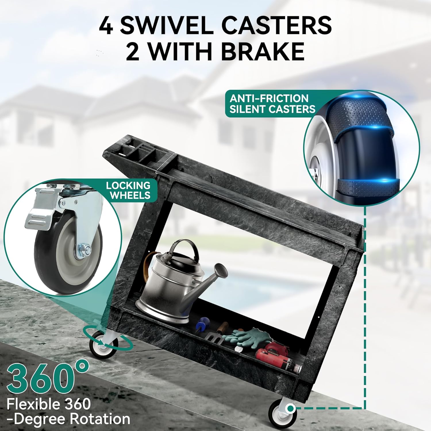 - LOCKING WHEELS: This utility service cart 2 shelf with four 5-inch swivel casters made of industrial-strength polypropylene for smoothness and durability, and two of them are lockable for 360-degree flexibility and labor-saving transportation. Meanwhile, the exterior thermoplastic rubber wrap not only absorbs vibration and reduces noise, but also prevents floor scratches and carpet snags.