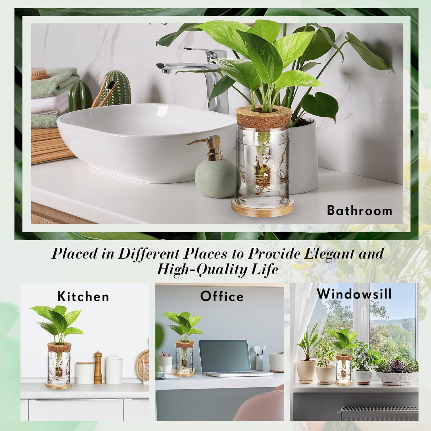 - Complete Package: we offer a complete greenery solution, each package includes 12 pieces of plant terrariums, 12 pieces of independent bamboo saucers, and 12 pieces of cork toppers with holes, for your home and office interior needs; The transparent bottle body can visually observe the roots of plants, easy to change water when observing the water level