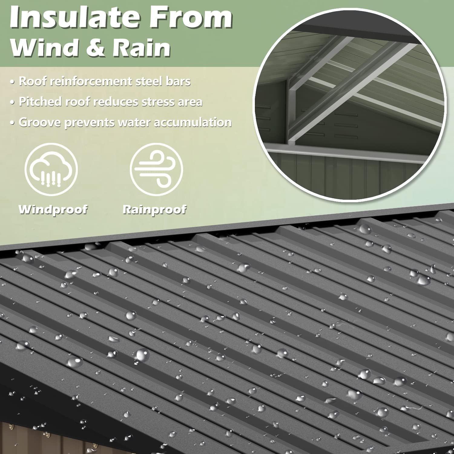 - [ Safety and Durability ]: Metal shed's pitched roof effectively prevents rainwater accumulation, while the equipped door lock ensures security. What's more, the equipped ventilation openings also allow for better air circulation.
