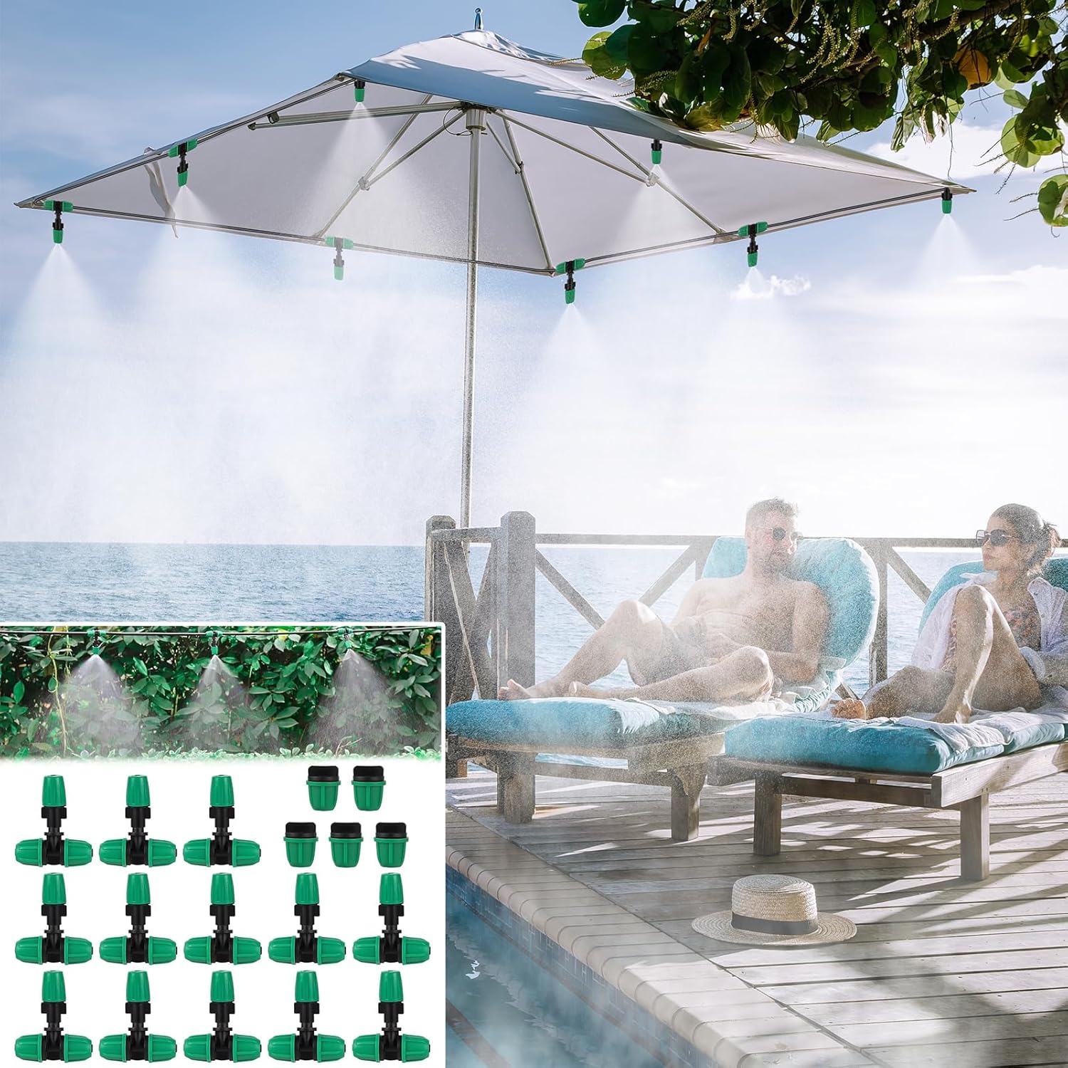 - Easy to install&Use: 20 Lock Barbed 6mm to 1/4 Inch Tee, 20 Adjustable Atomizing Nozzles 5 Lock Barbed 1/4 End Plugs.Great for Agriculture and Industry,greenhouse, lawn, garden, patio, balcony cooling,