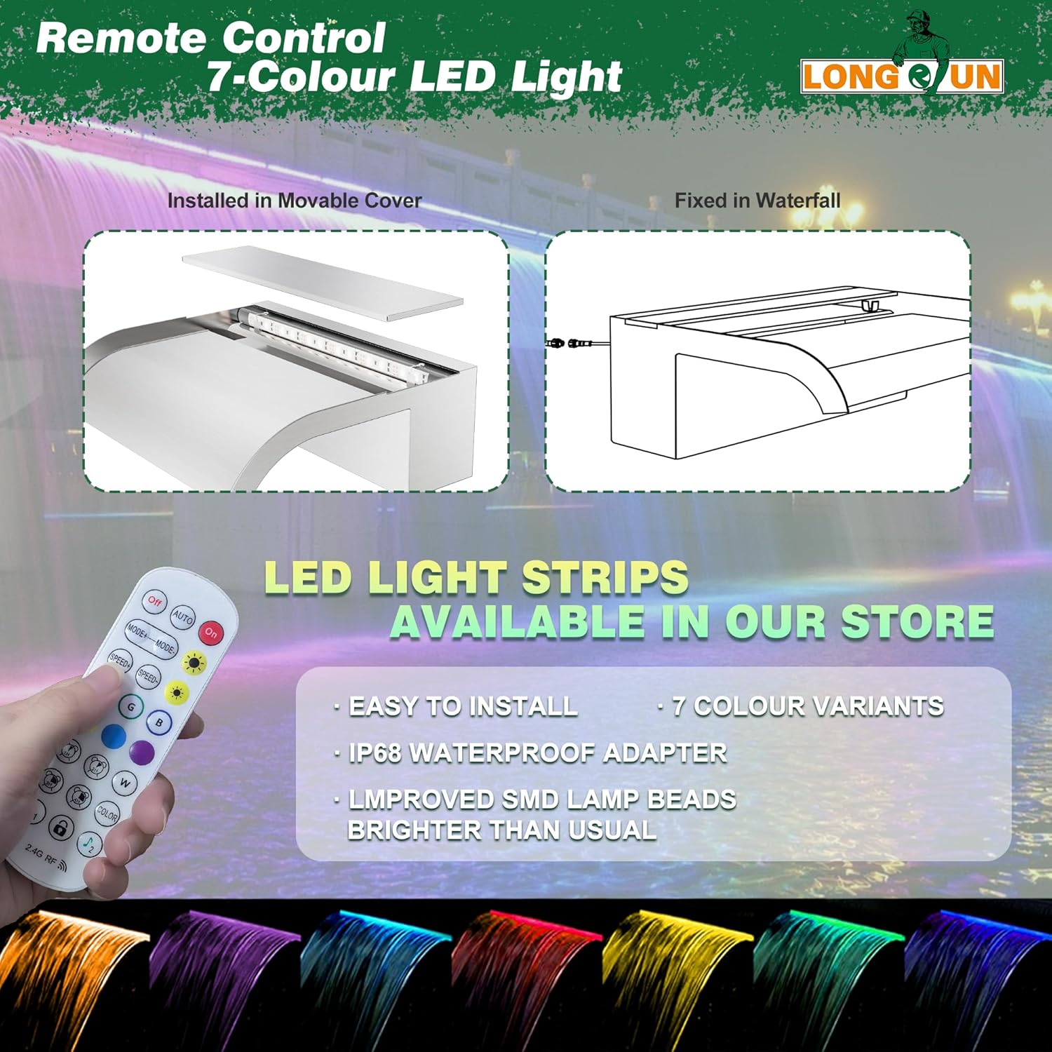 - ăDIY Decoration Pool & Pond fountainăLONGRUN waterfall spillway will make a decorative addition to your garden patio pond or swimming pool, it makes them more elegant, fashionable and beautiful. The color change of LED lights and the gentle sound of water running make your patio more special at night
