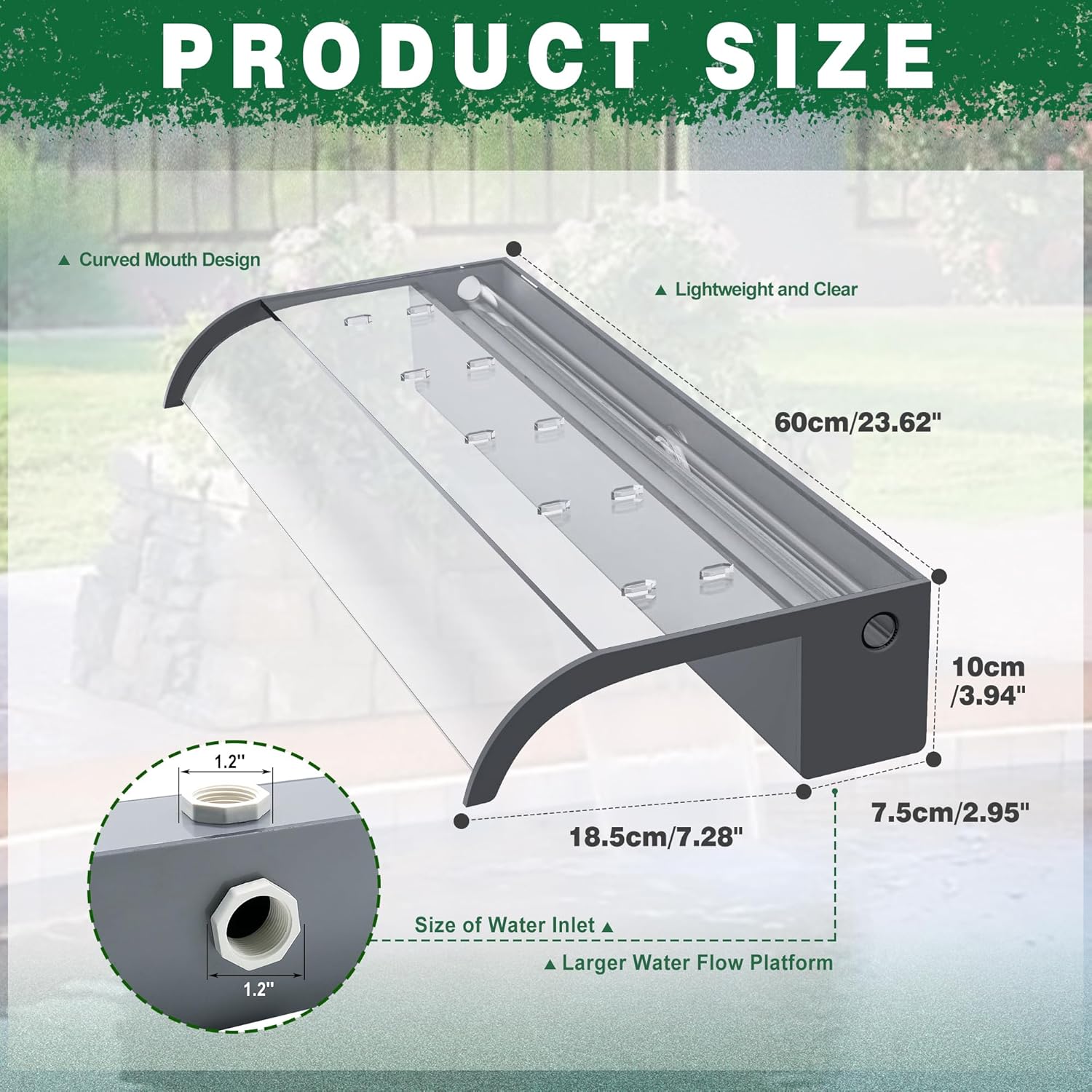 - ăWider Water Flow Platform & Curved Open Lip DesignăThe pool waterfall has an 8-inch wide integrated welding water platform, 3.94-inch high water storage tank platform, and 90-degree tilt angle. This design creates a stable, smooth, vertical waterfall for a stunning water display. The soothing sound and sight of the cascading water create a relaxing environment for you enjoy