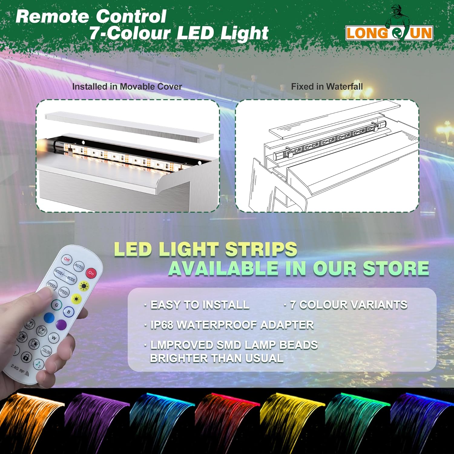 - ăDIY Decoration Pool & Pond fountainăLONGRUN waterfall spillway will make a decorative addition to your garden patio pond or swimming pool, it makes them more elegant, fashionable and beautiful. The color change of LED lights and the gentle sound of water running make your patio more special at night