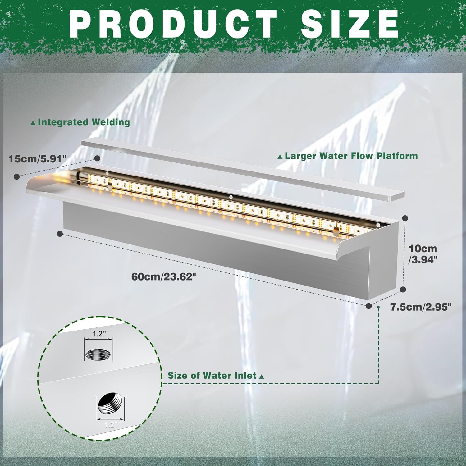 - ăUpdated Wider Water Flow PlatformăThe pool waterfall has an 8-inch wide integrated welding water platform, 5.9- inch high water storage tank platform. This design creates a stable, smooth, vertical waterfall for a stunning water display. The soothing sound and sight of the cascading water create a relaxing environment for you enjoy