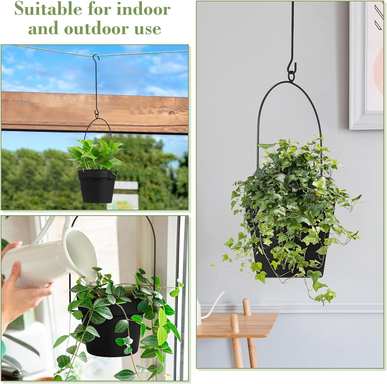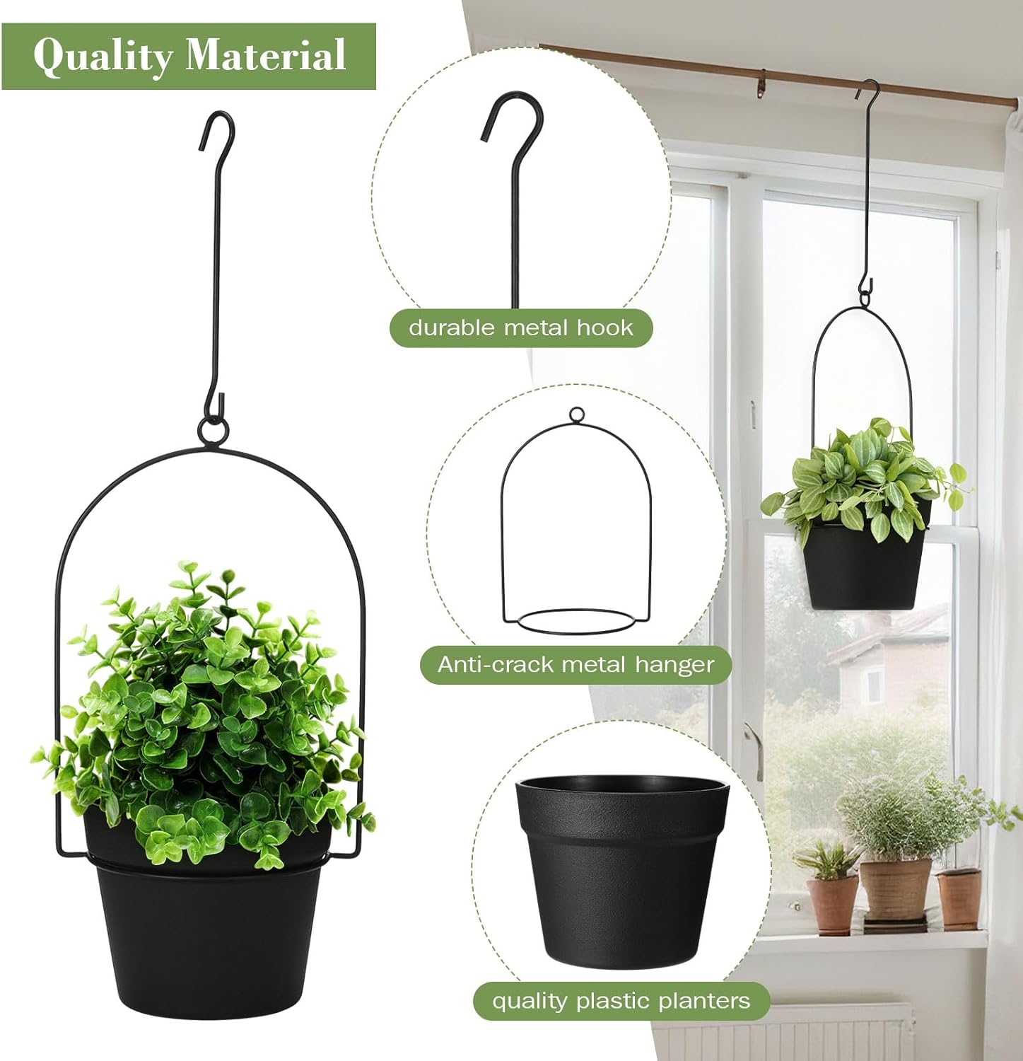 - Quality Material: with our hangers and hooks sturdy metal composition and quality plastic planters, you can ensure that your plants will be supported and displayed; Hanging pots for plants are resistant to rust and cracks, thereby providing durability and long standing use