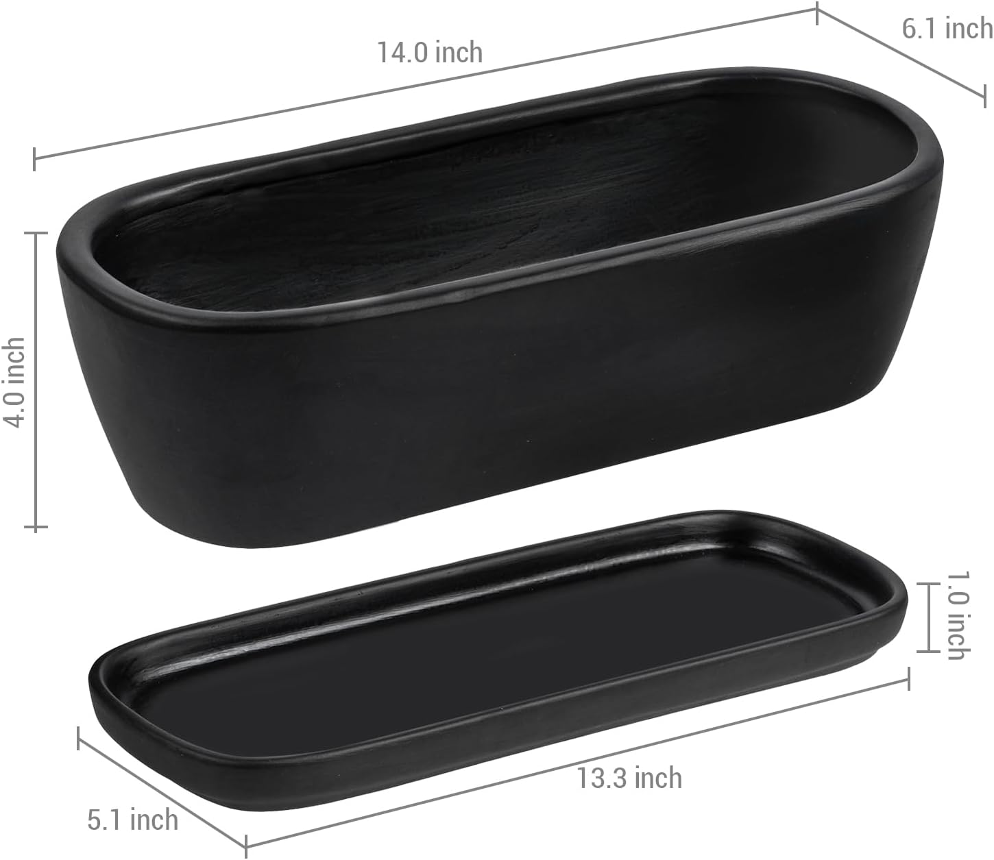 MyGift 14 Inch Oval Modern Matte Black Ceramic Succulent Planter Pot with Drainage Hole and Removable Saucer, Decorative Indoor House Plant Container for Flowers, Cactus, Herbs
