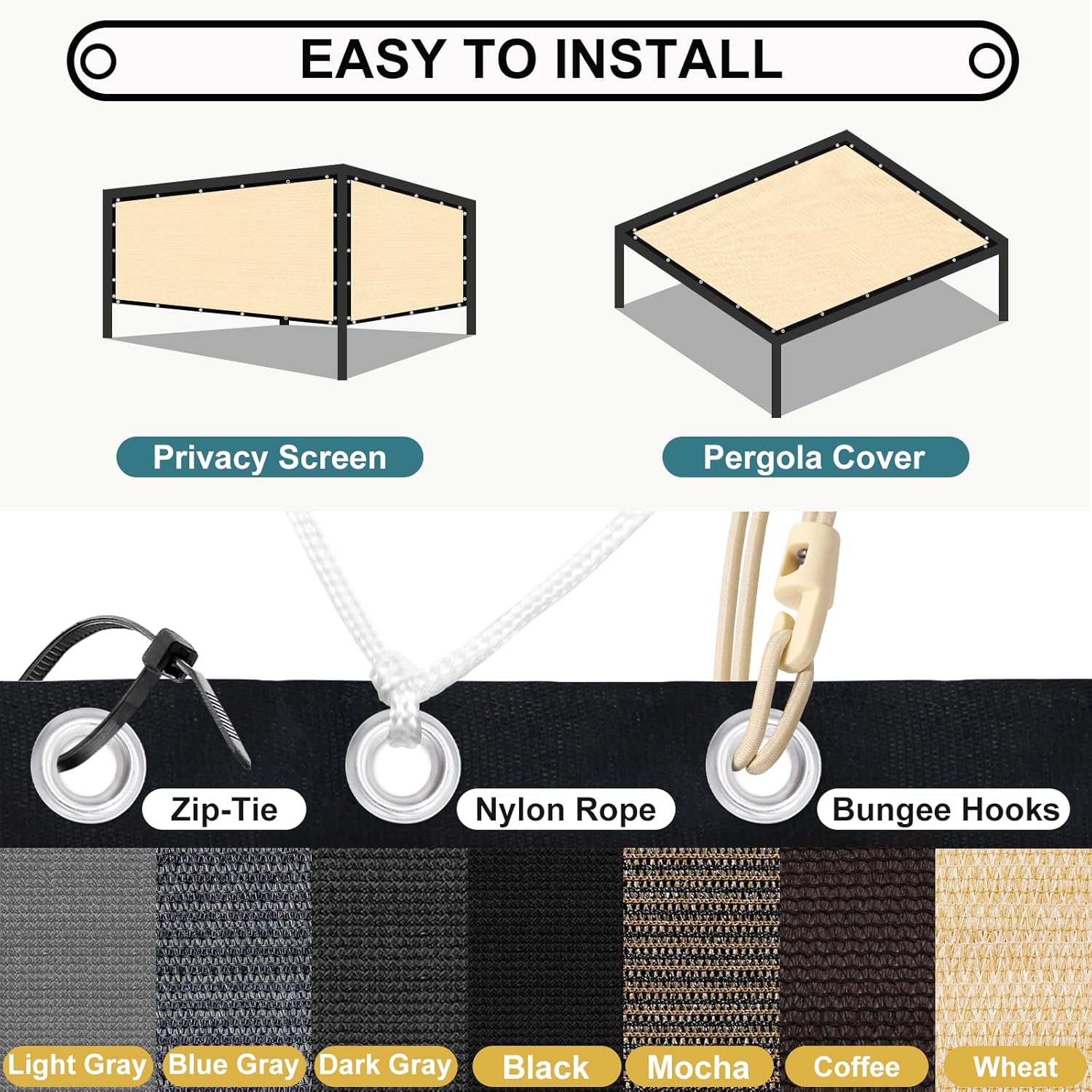 - Accessory Updated: Accessories have been updated from [Zip-ties, Ropes, Bungee Balls] to [Zip-ties, Ropes, Bungee Hooks]. Both versions are in circulation and will be shipped randomly. Easy to Install: With included grommets on each sides every 2 ft space and fixing accessories, you can easily attach the pergola shade cover to various structures while ensuring uniform stress. Whether you're looking to cover your backyard, carport, or playground, you can have it up and providing shade in no time