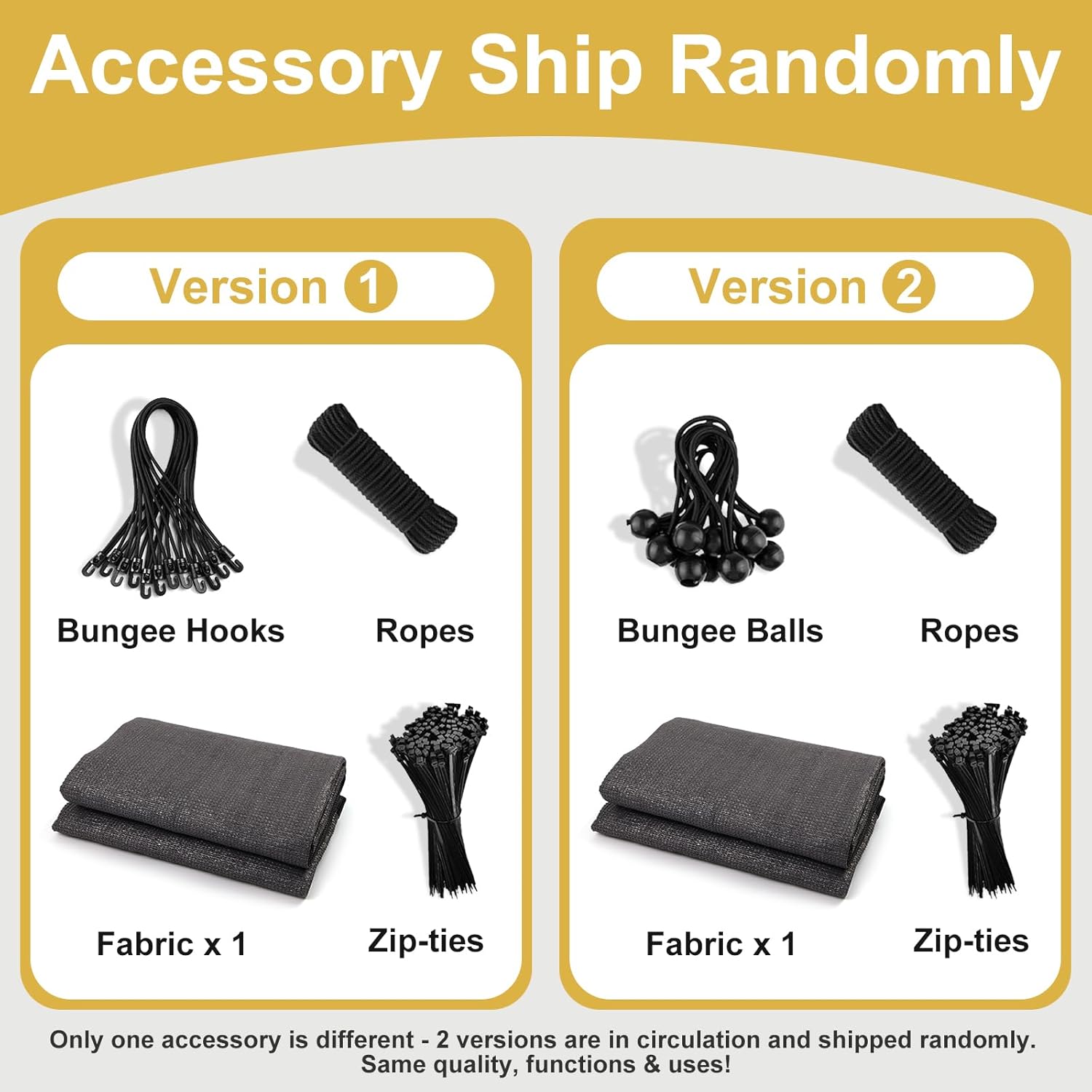 - Accessory Updated: Accessories have been updated from [Zip-ties, Ropes, Bungee Balls] to [Zip-ties, Ropes, Bungee Hooks]. Both versions are in circulation and will be shipped randomly. Easy to Install: With included grommets on each sides every 2 ft space and fixing accessories, you can easily attach the pergola shade cover to various structures while ensuring uniform stress. Whether you're looking to cover your backyard, carport, or playground, you can have it up and providing shade in no time