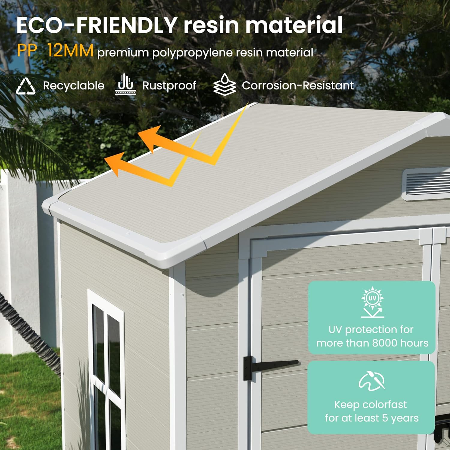 - RECYCLABLE RESIN MATERIAL:Our storage shed is crafted with 12 MM premium polypropylene resin plastic, which is recyclable. Resin shed is corrosion-resistant, waterproof, rustproof and with UV protection for more than 8000 hours, less bending and puncturing, worry-free for use in all weather conditions. It can be used daily for five years without fading