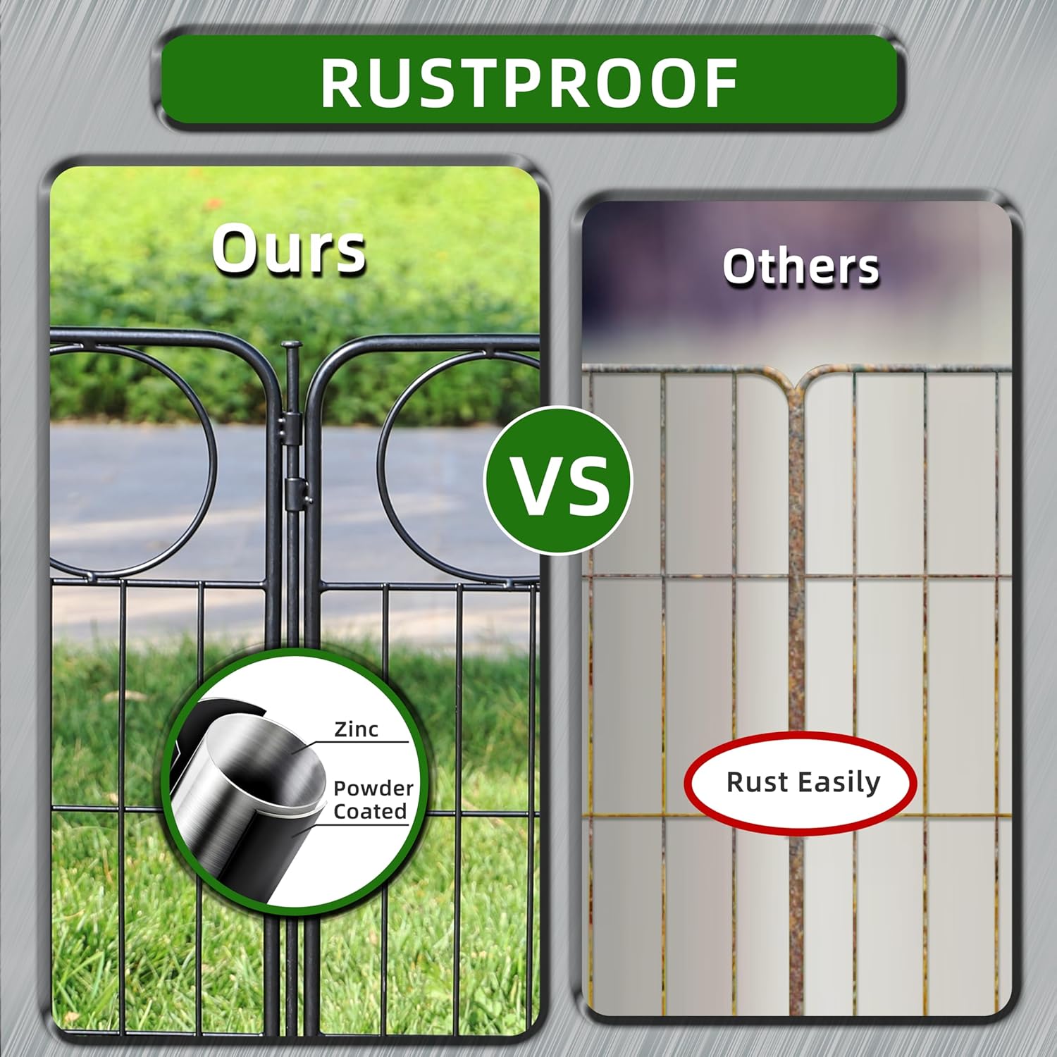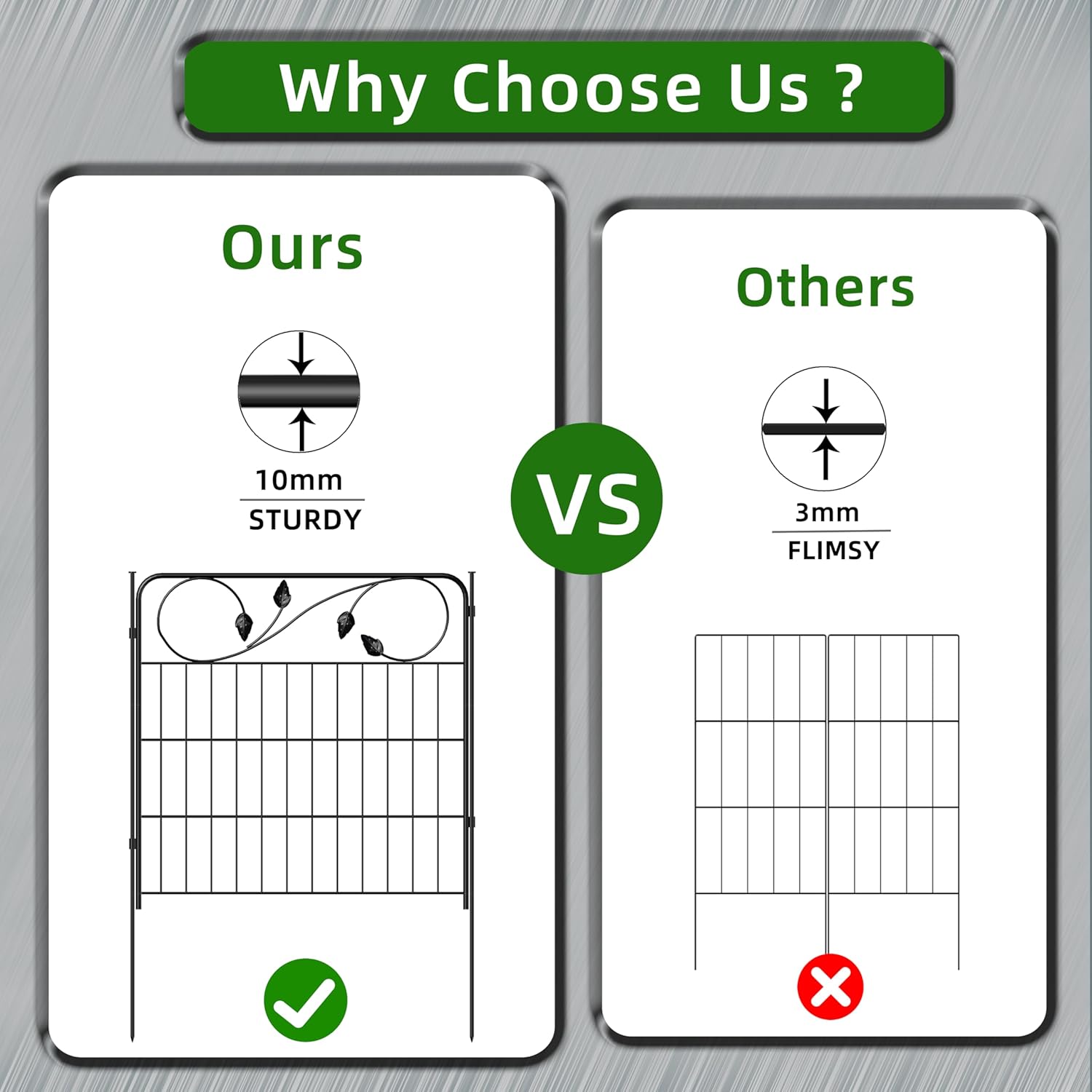 - STURDY STRUCTURE: The metal garden border fence panel made of thick iron tube frame and welded by thick iron wires, The stakes are 8mm diameter. The garden fencing for black color powder coated surface outside for rustproof material, Which are very sturdy and safe for decorating the yards.