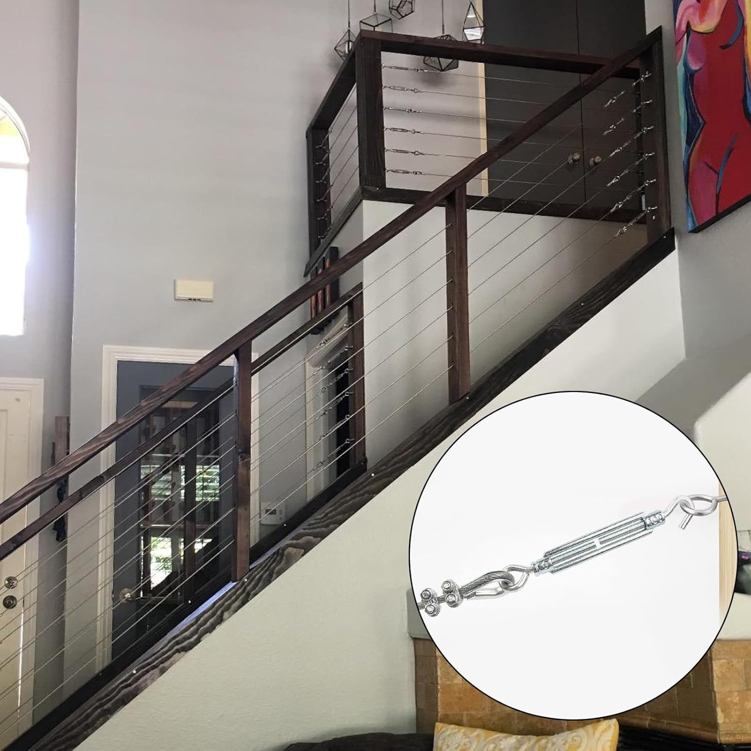 - 1/8" Cable Railing Kit: Package includes wire rope + complete accessories, which are a 100 ft steel cable, 5× M6 turnbuckle hooks and 10× eye screws, 20× U bolt saddle fasteners, 12× steel cable thimbles, 10× expansion pipes, and 1 cable clamp screwdriver