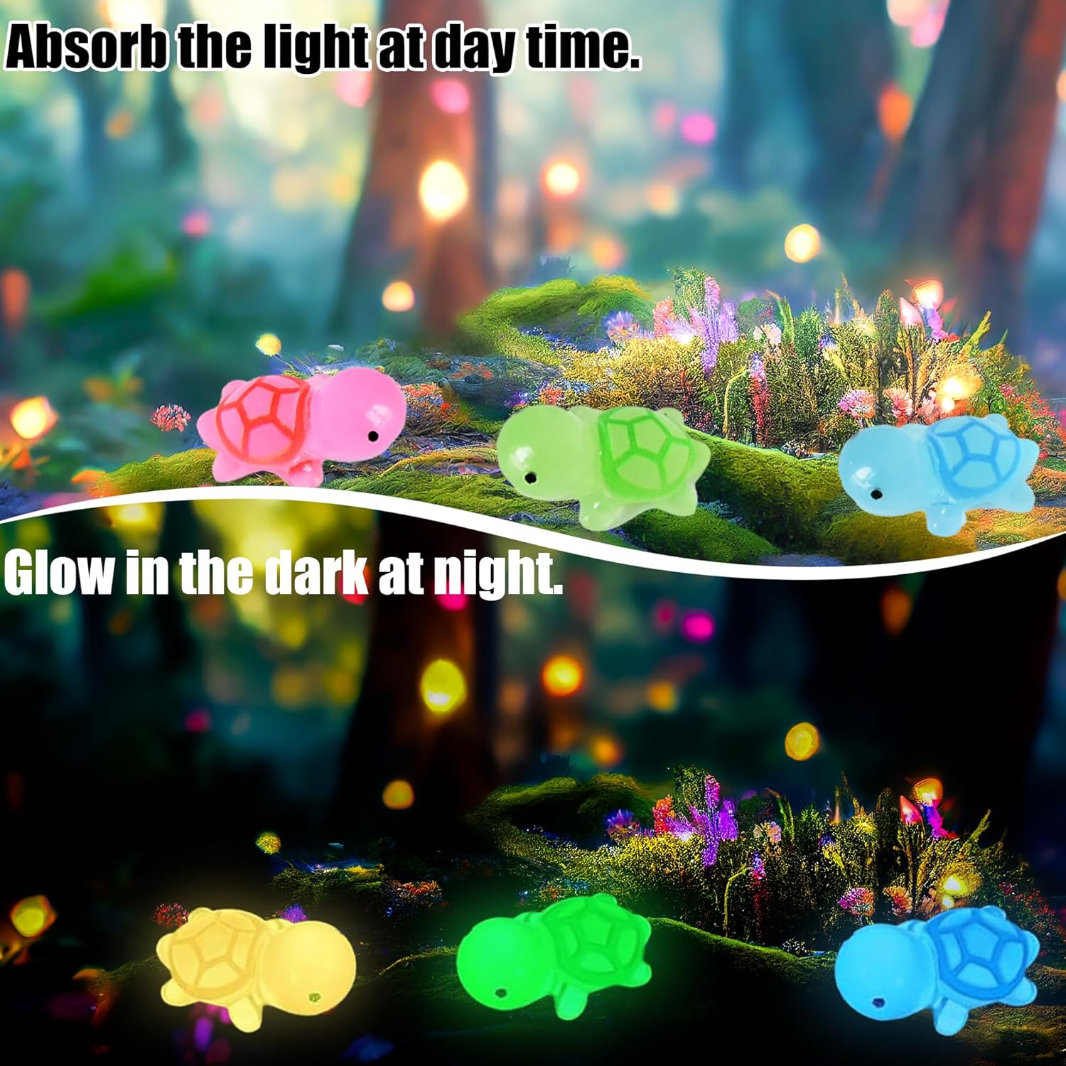 - Luminous Design: The luminous tiny plastic turtle can absorb sunlight in the daytime and emit light at night. The more sunlight it absorb, the longer it glows at night. The luminous design can bring more fun to your family or friends.