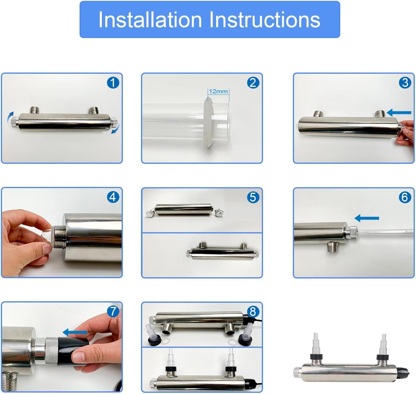 - QUALITY ASSURANCE - Made from durable stainless steel, our U-V disinfection resists corrosion and requires minimal maintenance. The UV lamp has an 8000-hour lifespan, ensuring reliable, year-round use. If you have any questions, please contact us and we will respond within 24 hours.
