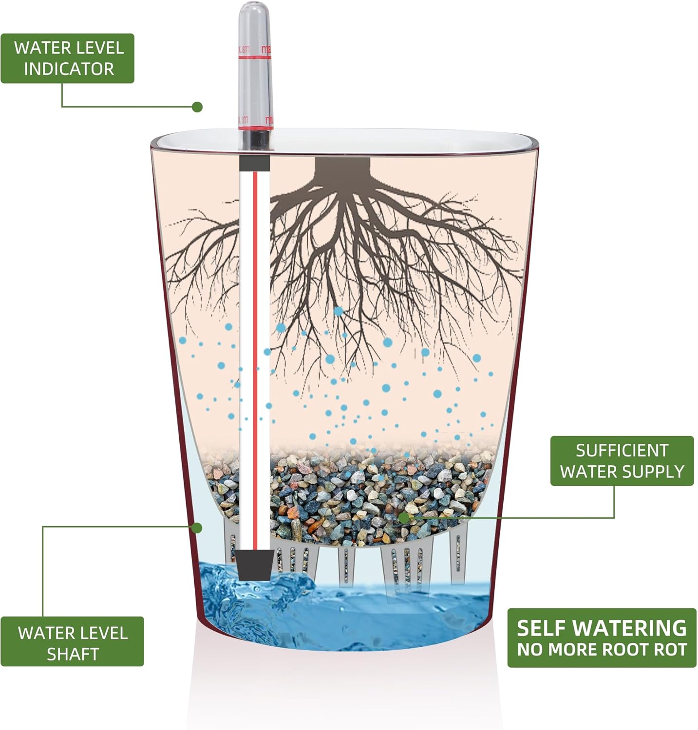 - SELF WATERING & NO MORE ROOT ROT - The smart unique sub-irrigation system is one of the most appealing aspects among all Dexceder planters. The easy-to-use separated integrated water reservoir or catcher- keeps your soil well aerated and automatic supplies plants with the right amount of ongoing moist air & nutrition for optimal growth. The insert indicator shows you the exact time to water again. The full water supply period can single-handedly last over 3 weeks based on different live plants