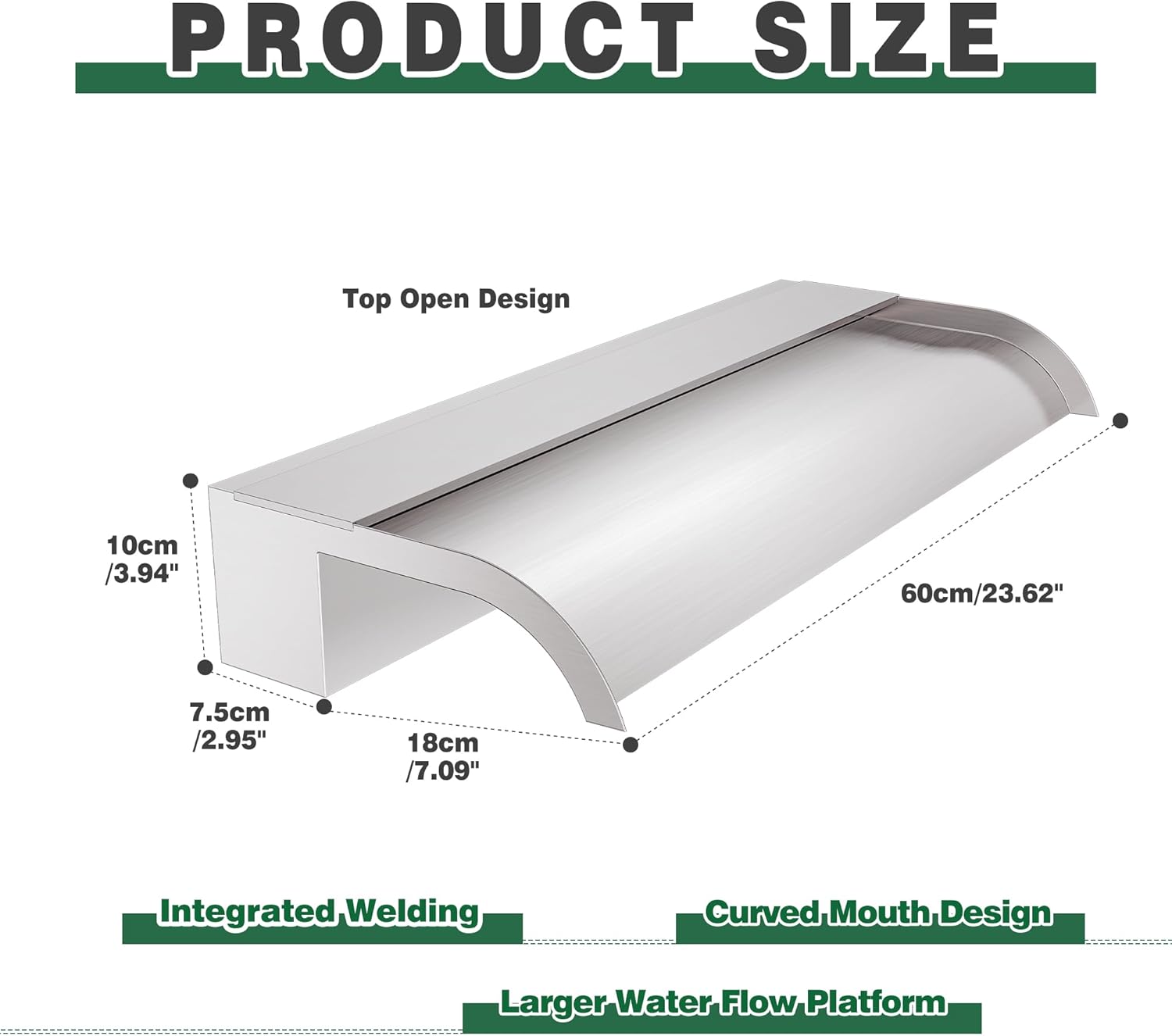 - ăAnti-Rust Spillway Waterfallă- Our welded in one body one-piece 304 stainless steel construction of this spillway waterfall provides long-lasting strength, rust resistance, and leakproof performance. The open lip design creates an elegant freefalling waterfall that adds decorative flair to ponds and pools. The soothing sound of the cascading water promotes relaxation and tranquility. LED light strips not included, but available separately.