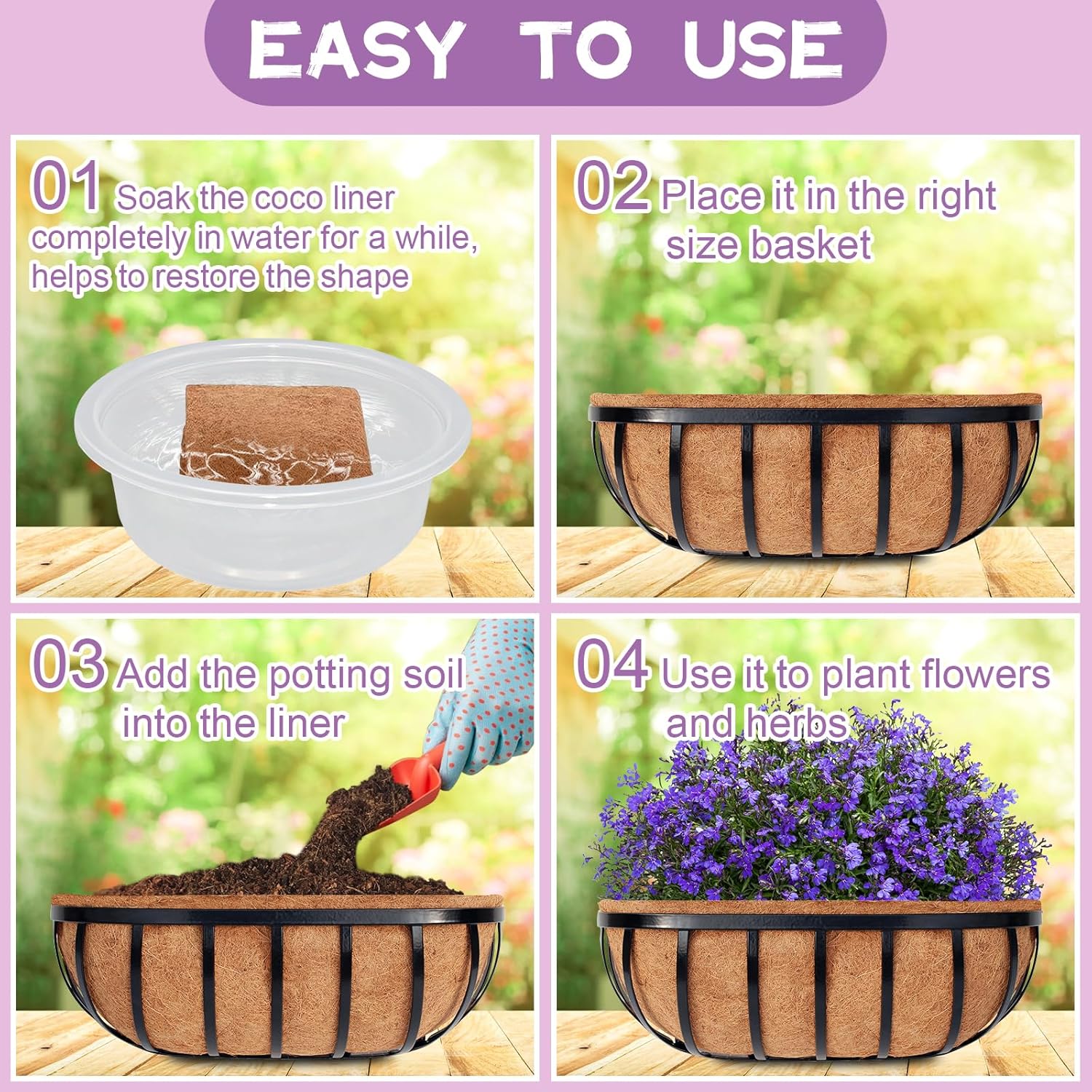 - Package Included: You will receive 4 pcs trough coconut fiber liners, each measures about 36 inch in diameter and 7.48 inch in depth. Half-moon shape can match perfectly with most wall flower pots and hanging baskets, that not only used for plant and flower, also great as indoor and outdoor decor, this renewable resource can degradable and compostable after use, it's a good choice for all types of planter liner