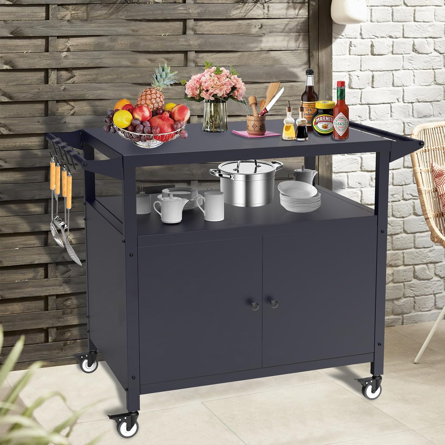 Outdoor Grill Table with Storage, Movable Grill Cart, Outdoor Kitchen Island Prep Stand Station,Blackstone Griddle Stand, BBQ Serving Cart Rolling Bar Cart with 4 Utensil Hooks