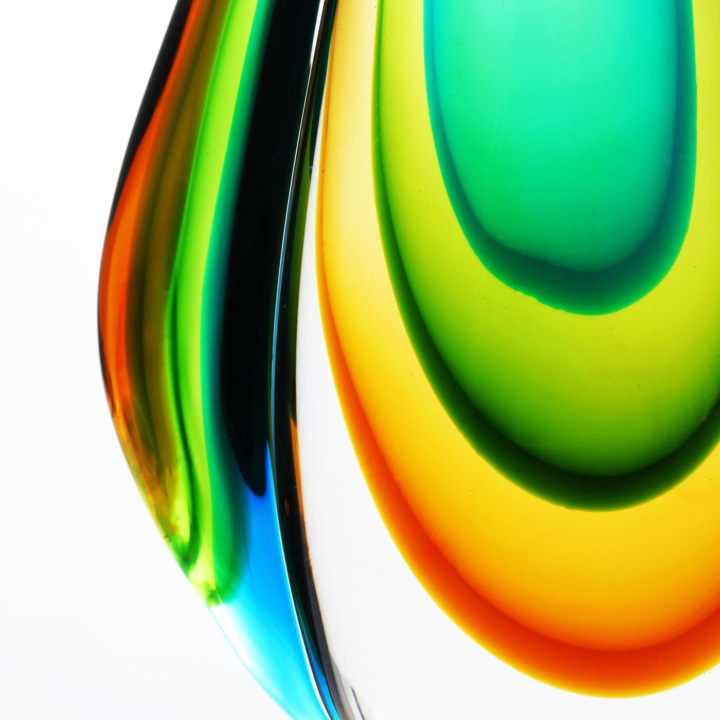 - Unlock the mesmerizing beauty of Murano style glass production with our handcrafted glass blowing and glass casting pieces. In this piece, multiple layers of glass are heated and pressed together to create slight variations in color, size, and thickness, making them one-of-a-kind treasures for your collection.