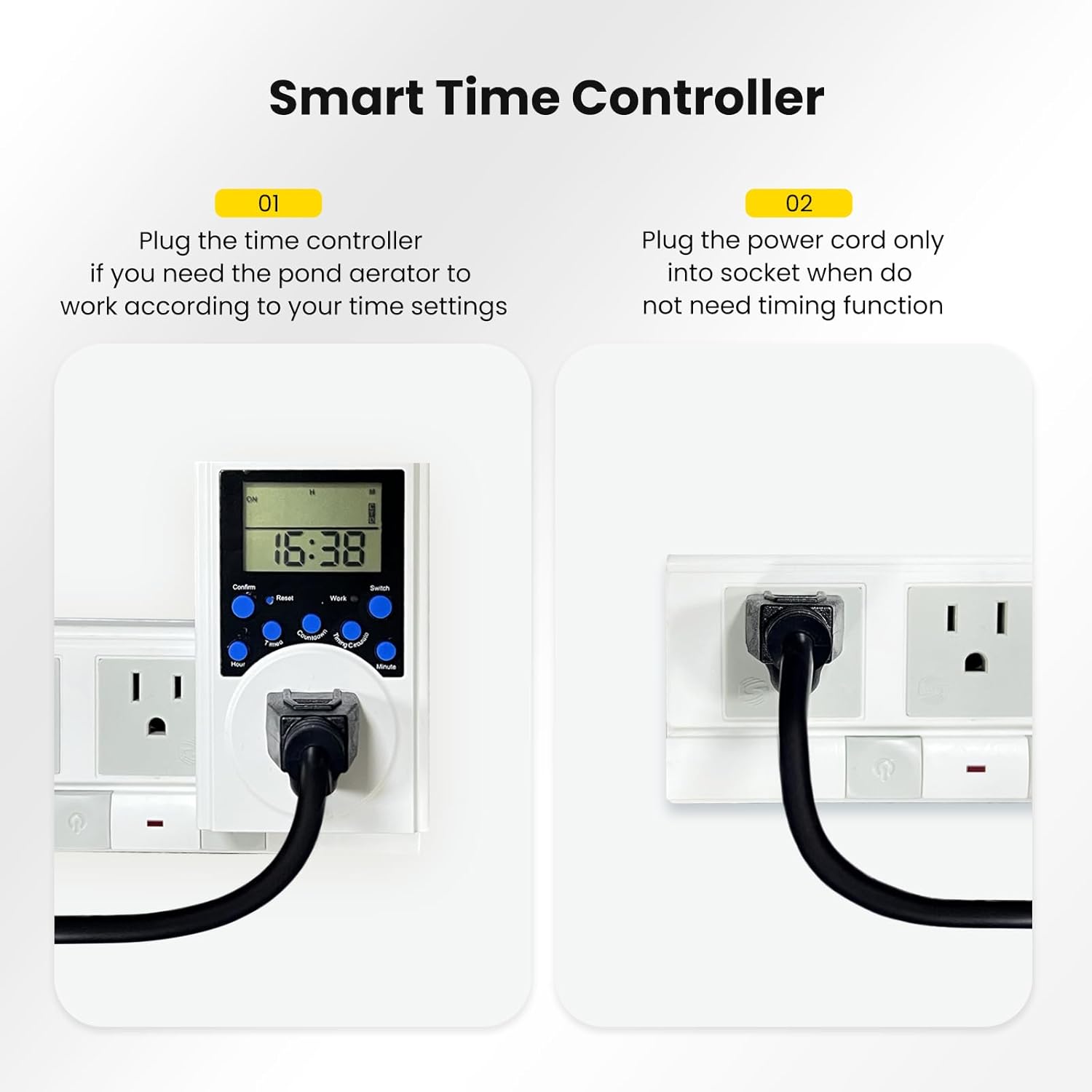 - Multiple Working Modes — Various timing functions could be set for energy efficient via the smart time controller such as automatic timing switch operation, countdown timer alarm, intermittent duty for the pond air pump aerator outdoor. The pond air pump could keep working without using the timer controller by manually turning on the switch after power on