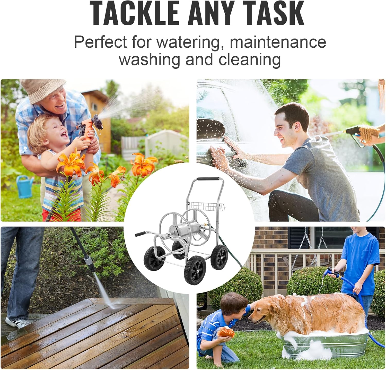 - Versatile Application: Adding a storage basket to the hose reel cart offers a convenient way to keep your gardening tools and accessories organized and within reach. The water hose reel cart is perfect for watering plants, cleaning and maintenance tasks, bathing pets, or other outdoor activities.