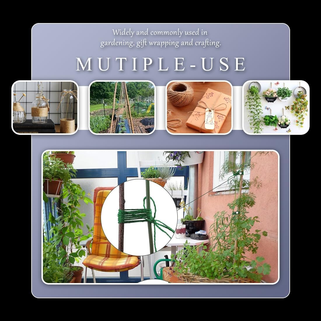 - 【FEATURES】Our twine is made from high-quality natural fibers. No harmful substances, no extreme stinky smell. , biodegradable, and safely used around the house. Soft but strong, and widely used in packaging, strapping, gardening, greenhouses, pastures, bonsai because of its abrasion resistance, corrosion resistance, rain resistance.