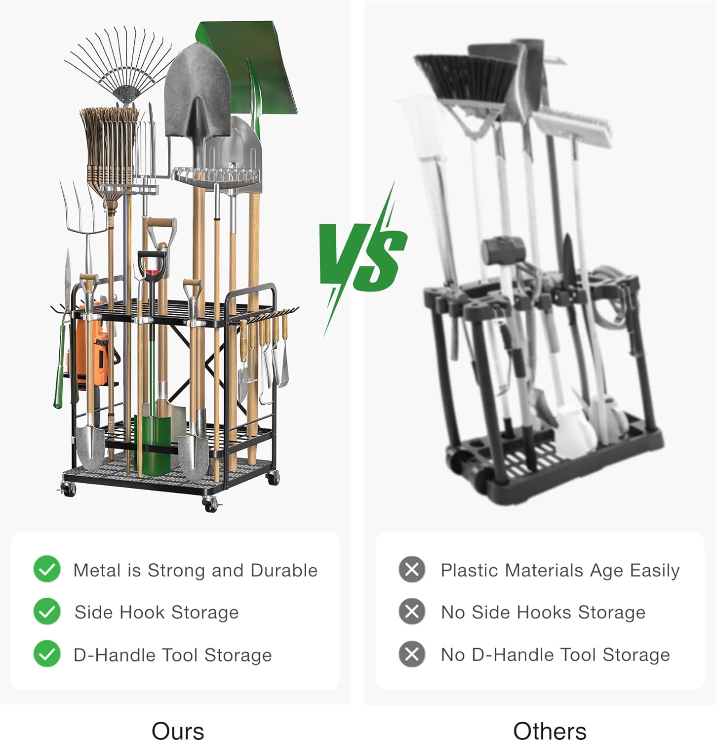 - 【Robust Structure with Wheels】 Our garden tool organizer is constructed with durable, coated metal for a stable structure, designed for both indoor and outdoor usage. You can rely on it to perform impeccably even outdoors under the harsh sun or heavy rain. Unlike the plastic variants, our cart stays firm and does not tip over