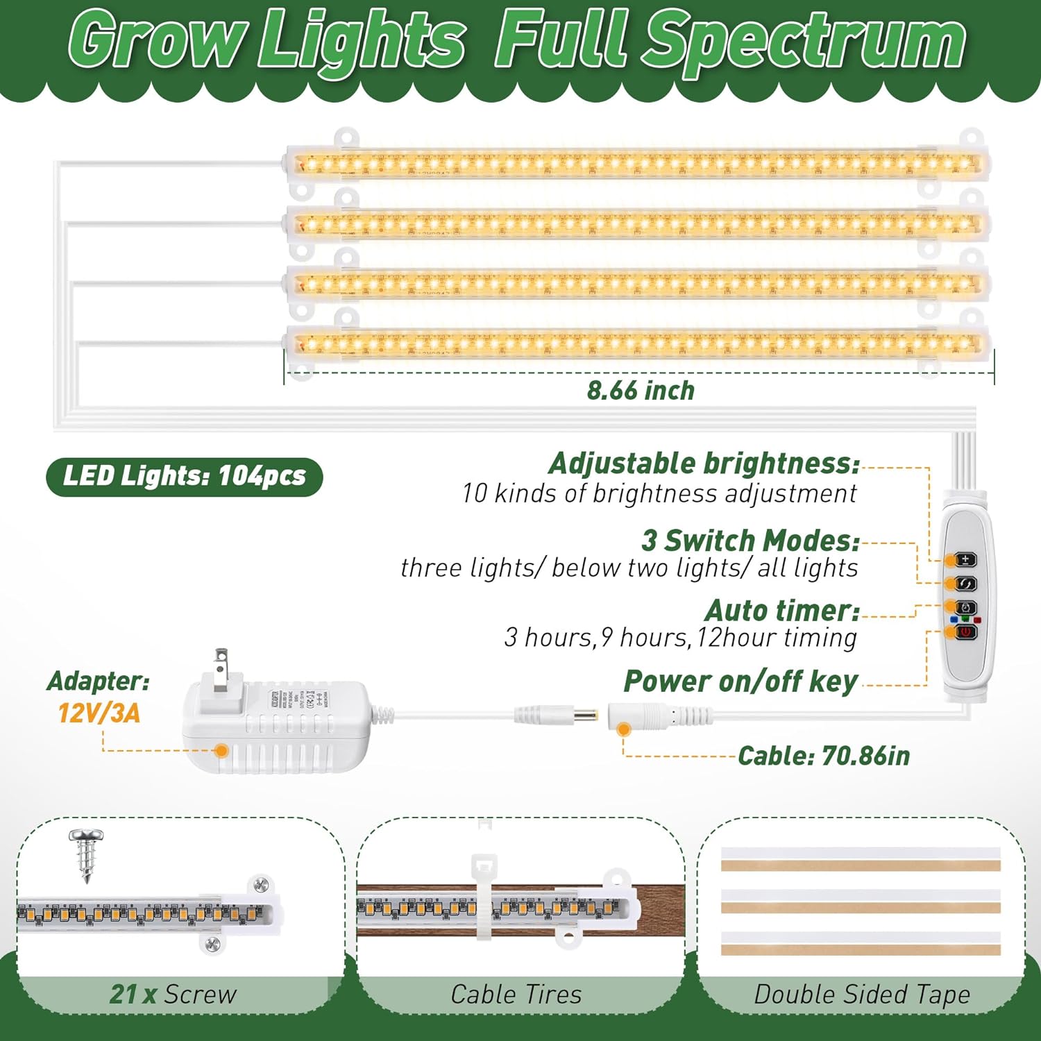 - Full Spectrum Growth Lights: illuminate your plants with 4 in 1 full spectrum growth lights, equipped with timer functionality and brightness adjustment; Covering wavelengths from 380nm to 800nm, these lights accelerate photosynthesis, promoting the indoor growth of plants