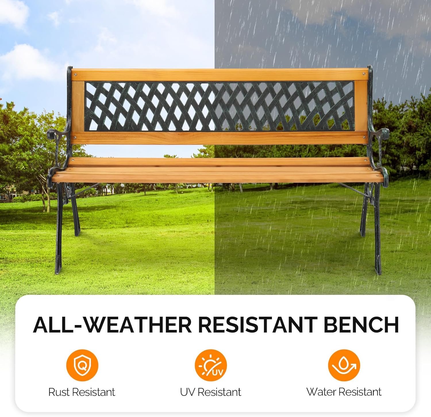 - Sturdy and Rust-Resistant: The metal bench outdoor is constructed from reinforced steel and hardwood, ensuring durability and long-term use. Its rust-resistant finish and PVC backrest pattern enhance resistance to weather elements, making it an ideal and lasting garden fixture