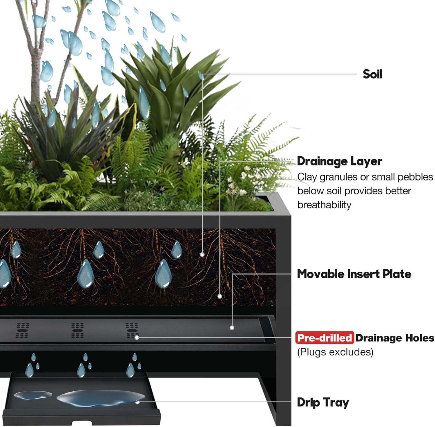 - METAL PLANT BOX: This black planter is made of steel with powder coating; The surface is wear-resistant, corrosion-resistant and it has a long service life; You don't have to worry about rain corroding the surface of this pot; Ideal for commercial or residentia use;
