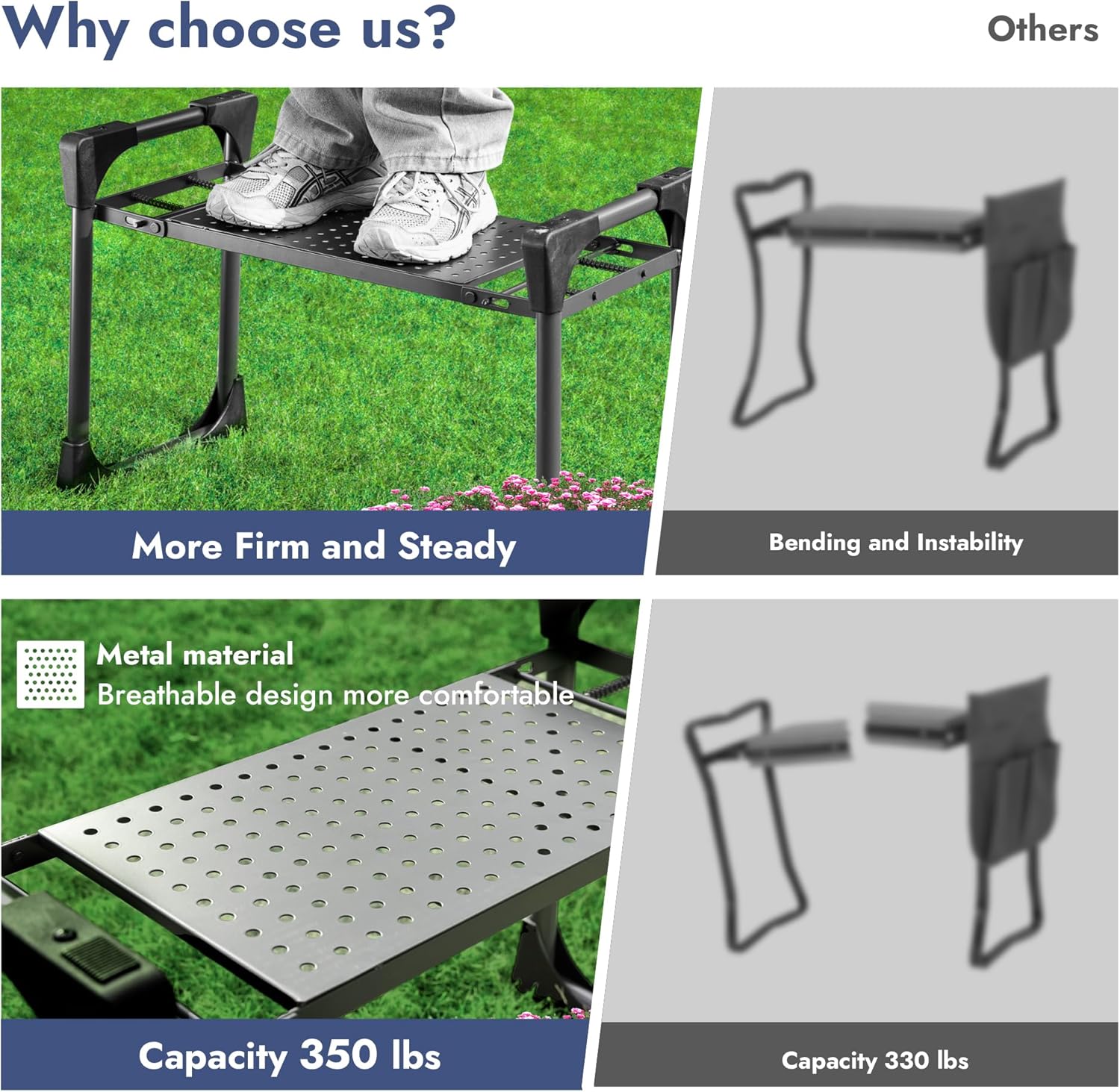 - ăHolds Up To 350 lbs! ăGardening work seat is made of steel, which is stronger than the older generation. The reinforced design with four additional protective corners is more ergonomic and suitable for long-term gardening work.