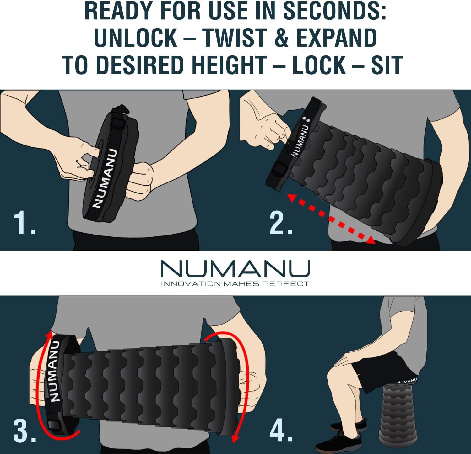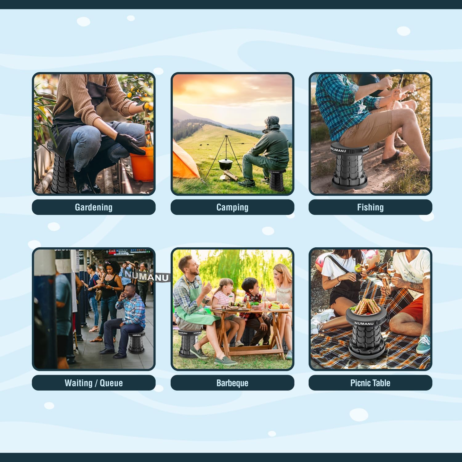 - â¨ăENDLESS OPTIONSăNUMANU Portable Telescopic Collapsible Stool has many usage options such as: Camping, Hiking, Waiting in Line, Gift, Live Concert Events, Plumbing, Construction, DIY/Fixing, Fishing, Gardening, Resting, Travel, Commuting, Bus, Train, Subway and More.