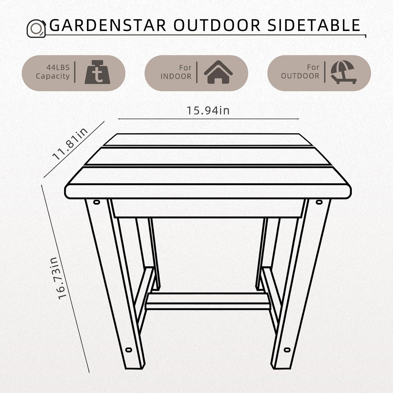 - ăModern Design MaterialăGARDENSTAR outdoor side table, made from UV-resistant HDPE, combines the elegance of natural wood with exceptional durability. Unlike traditional wood, it remains sturdy in any climate. The smooth tabletop is easy to clean with soap and water, while sun suppressants ensure long-lasting color without fading or darkening.