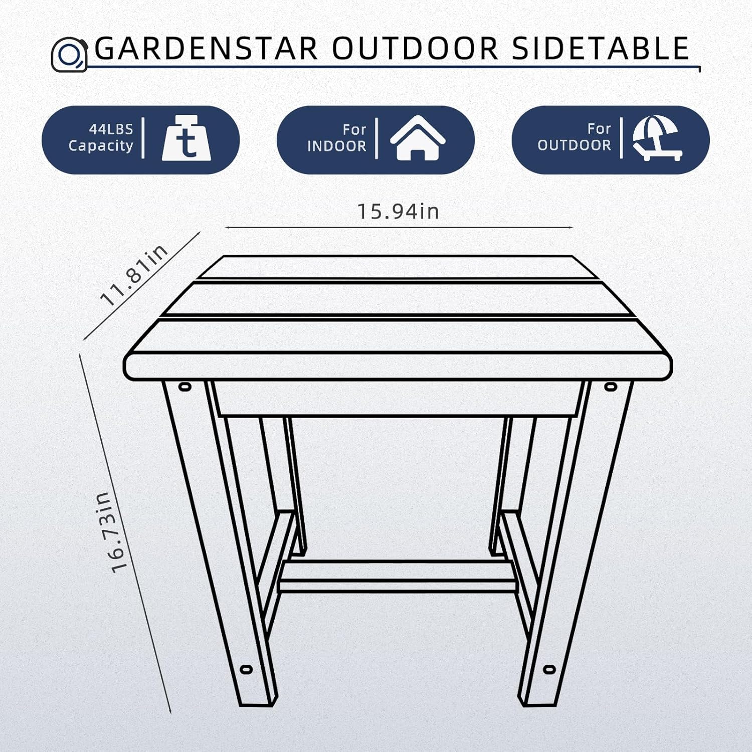 - ăModern Design MaterialăGARDENSTAR outdoor side table, made from UV-resistant HDPE, combines the elegance of natural wood with exceptional durability. Unlike traditional wood, it remains sturdy in any climate. The smooth tabletop is easy to clean with soap and water, while sun suppressants ensure long-lasting color without fading or darkening.