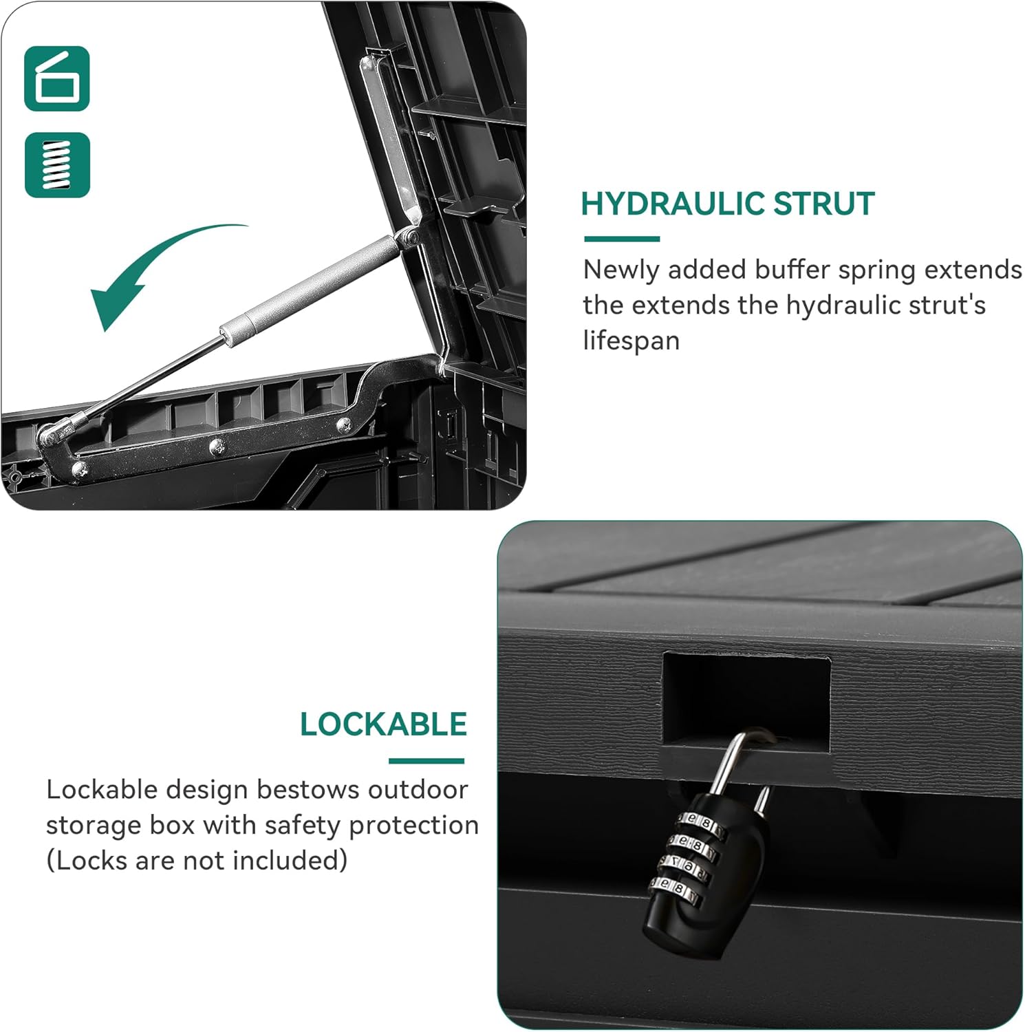 - Attention to Detail: Equipped with hydraulic rods, the patio storage box offers smooth and impact-resistant functionality with easy opening and secure closing of the lid without risking finger injuries; The lockable lid protects your items effectively