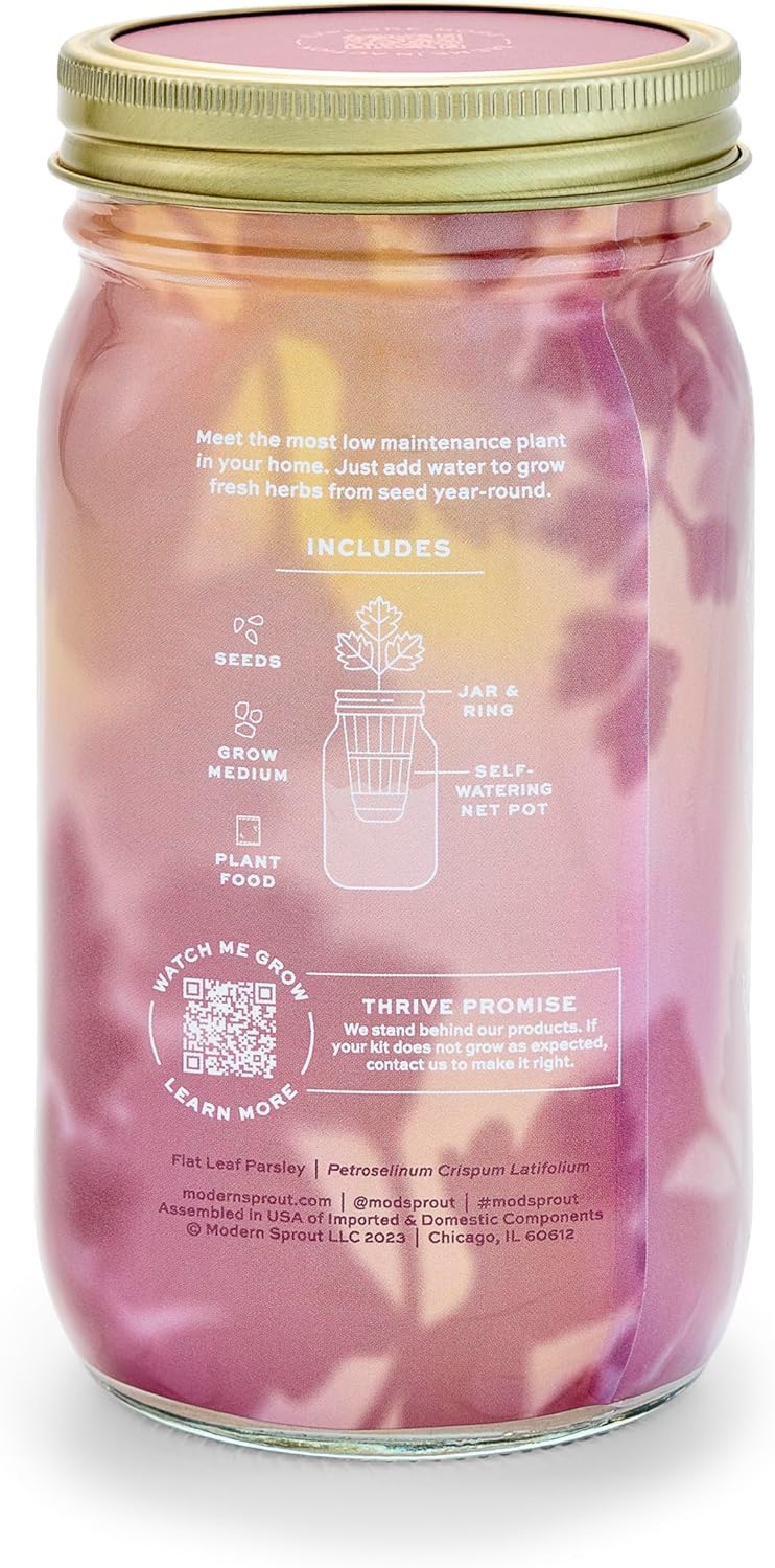 - Stylish & Functional Design: This thoughtfully designed kit features a durable mason jar with a removable sleeve - both made of recyclable materials, combining aesthetics and functionality for modern indoor gardening; It offers a minimalist growing experience that complements any living room shelf, bedside table, or sunroom nook - perfect for growing fresh parsley indoors with ease and style